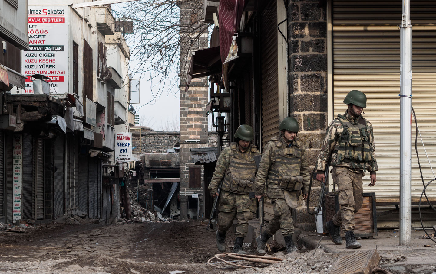 Passing through a checkpoint in Cizre, where soldiers wearing balaclavas and carrying submachine guns hold up residents for hours, the commander in charge is hesitant about giving us access.