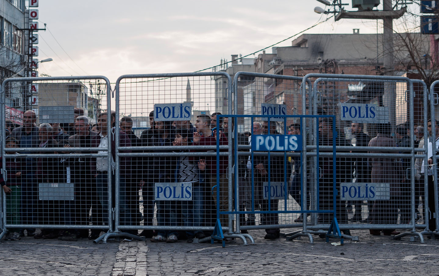 A small crowd has gathered outside the shuttered storefront office, and local residents chatter excitedly, anxiety etched on their faces. Nearby, we meet a local activist from the embattled Yenisehir neighborhood. He leads us out of the downtown and through a network of side streets, walking at a brisk pace and constantly looking over his shoulder. “Take off your sunglasses,” he instructs me. “You stick out as foreign.”