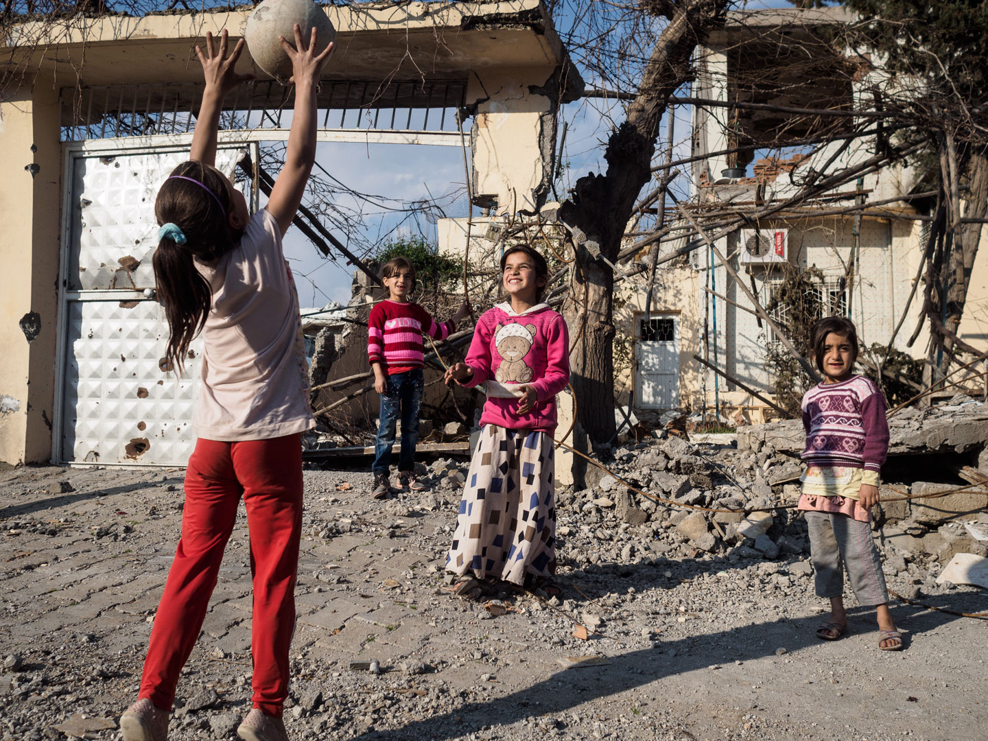 Old women hang their laundry under the cover of the concealing blankets while kids play in the dirt street under a cloudless sky. Only a few cobblestones are now left on the roads and sidewalks between barricades. It’s as if this Kurdish community has put into practice a famous slogan from the 1968 Paris revolt—“Beneath the paving stones, the beach.”