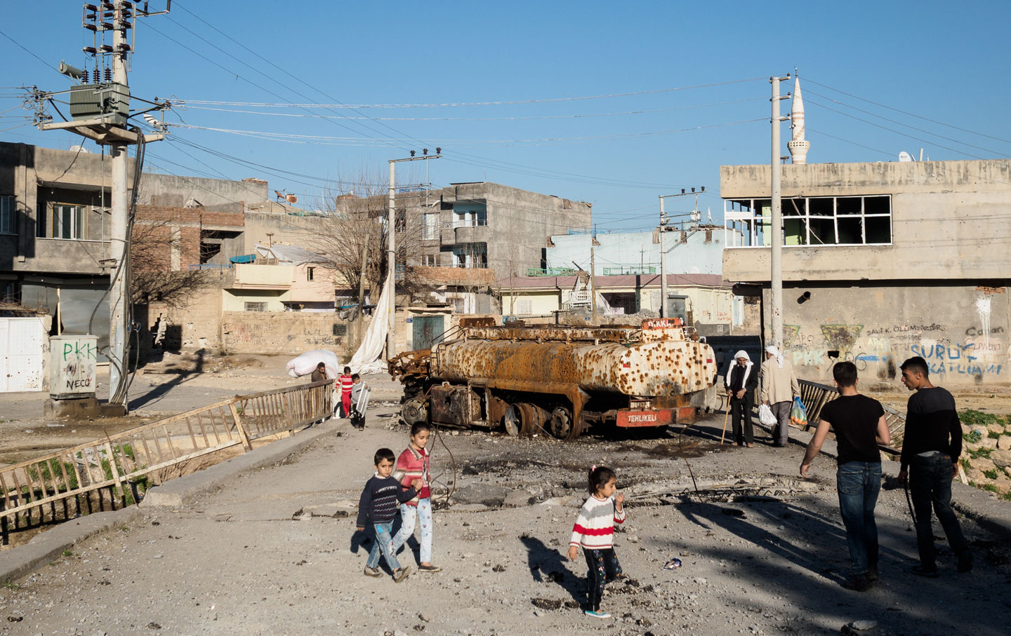 We finish our tea and are then led by a different guide through another maze of barricaded streets where “PKK” and “YPS” are scrawled on the walls. Jumping into the back of an unmarked white van, we are driven across town to the neighborhood of Firat, which has also joined the rebellion. The bridge connecting the district to the city center is partially blown up; a gas truck riddled with bullets has become a barricade on the other side. “They blew up the truck when security forces tried to invade the other day,” our guide says, referring to PKK guerrillas. We had also seen blown-up trucks in many areas of intense fighting in Cizre; these makeshift bombs are a common weapon deployed against government forces.