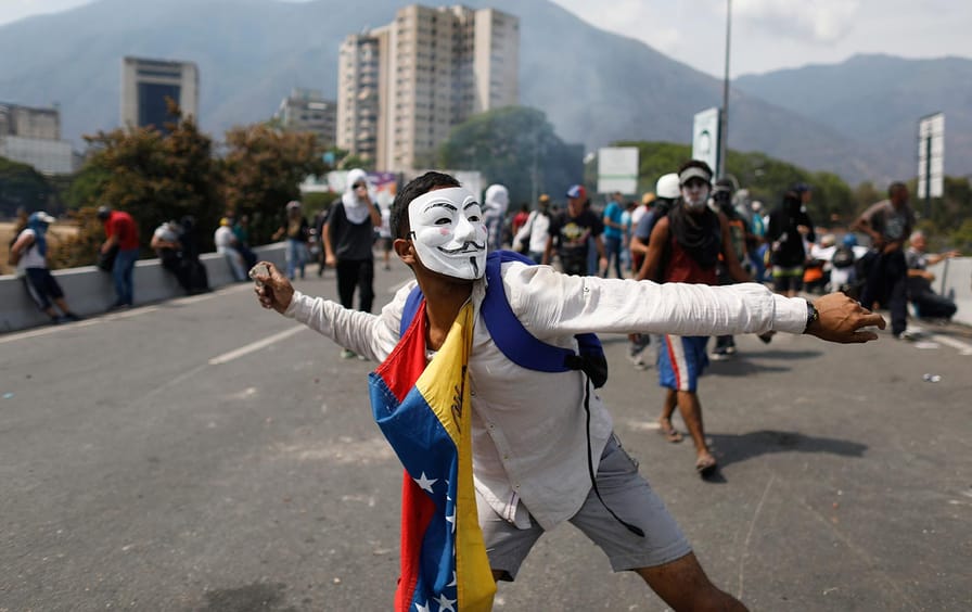 Hooded protesters hurl rocks and other projectiles toward soldiers loyal to Maduro, who force them back with tear gas. The smoke wafts into the crowds, and people stampede back up the street, screaming and covering their faces.
