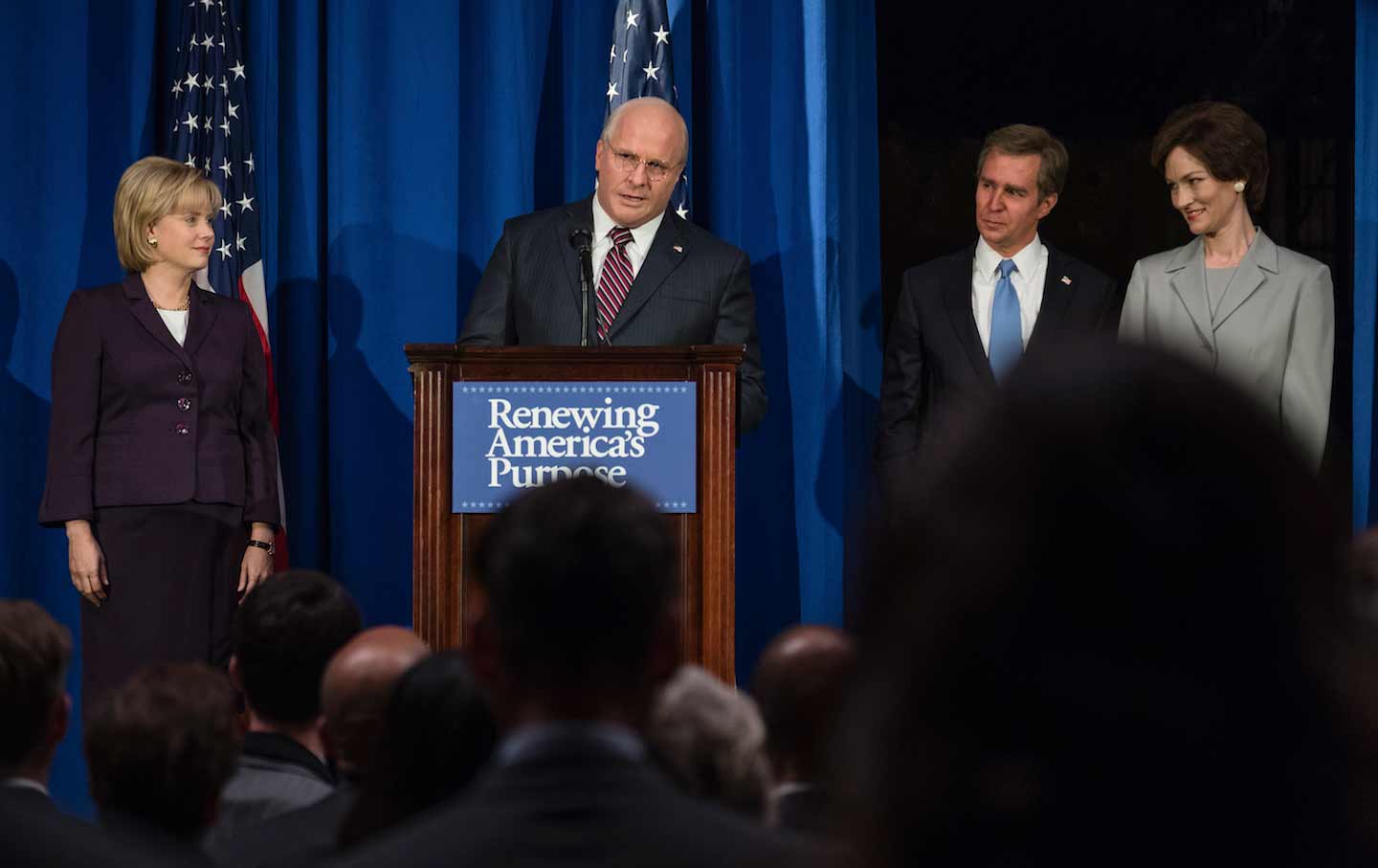 Vice crams so much detail about this subject into its 132 minutes, and is so determined to keep up the necessary pace for japing characterizations and comic digressions, that cracks eventually open in the surface. Topics are broached and then abandoned (remind me: What exactly happened with Valerie Plame?); new scenes start out of nowhere. McKay has the energy to carry you past these rough spots, though on a second viewing you might wonder about the material he must have cut, and wish he’d done a better job of smoothing the edits. And while McKay makes no such flubs when he integrates social-psychology research and propaganda methods into his story—here are the public-relations focus groups that helped sell the Iraq War, and the pristine blonde flamethrowers of Fox News who kept America heated up—the lessons have a village-explainer tone. Despite Naomi Watts’s uncredited turn as a Fox News talking head, these passages diverge from the celebrity footnotes of The Big Short. For one thing, they’re not funny; and if we, the movie-going public, are indeed as abased, as vitiated, as McKay’s Law implies, then it’s presumably too late for us to learn from them, anyhow.