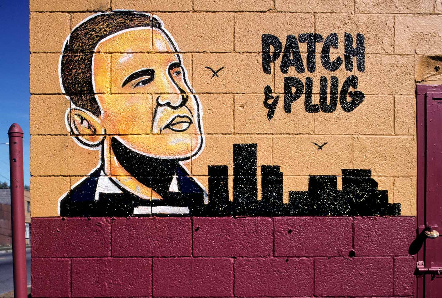 And on a tire shop in Detroit, Obama is portrayed next to the words Patch & Plug.