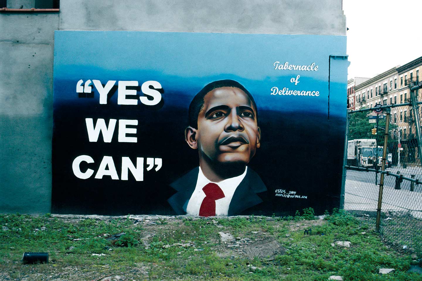 Artist Lance Estos Bradley, proud of the mural he painted for the Tabernacle of Deliverance in central Harlem, remarked: “I picked the photograph myself from the Internet. It reflects a moment in time when a black man was elected president. I didn’t think it would happen in my lifetime, and it may never happen again.”