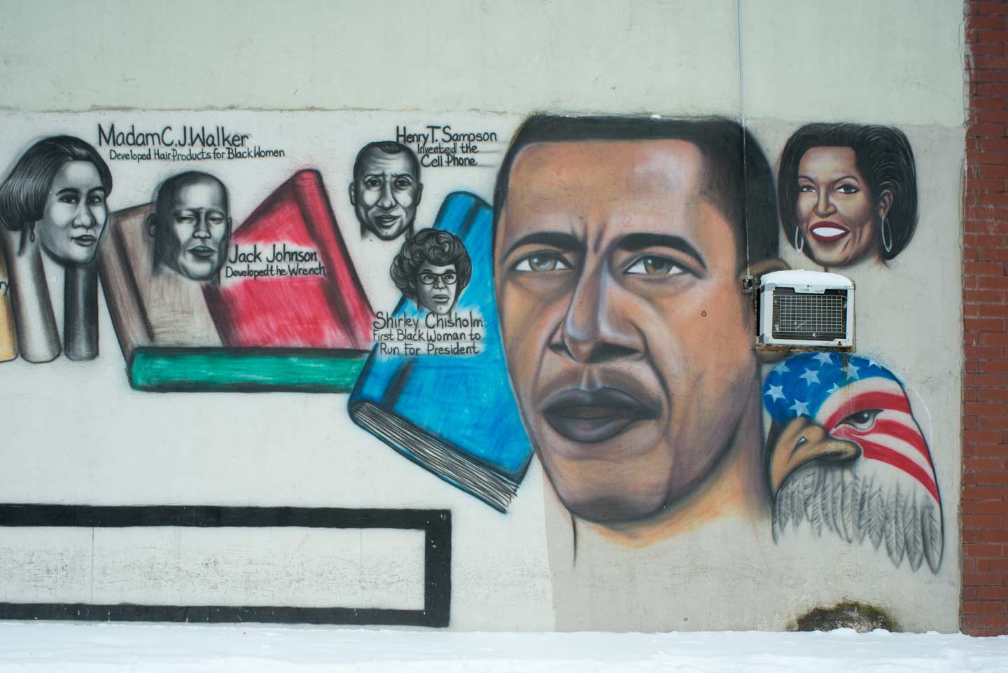 In a mural on Chicago’s South Side, Obama is shown with black inventors, with Michelle, and with Shirley Chisholm—the first black major-party candidate to run for president, in 1972.
