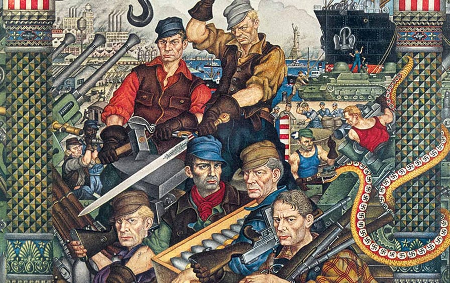Contrast, for instance, Rockwell’s rightfully iconic Rosie the Riveter (the cover of The Saturday Evening Post’s May 29, 1943, issue) with Szyk’s Arsenal of Democracy (the cover of the September 12, 1942, issue of Collier’s). Both patriotic works show the hardworking people behind the manufacture of American arms and armament, but from vastly different perspectives. Before the backdrop of a huge American flag, Rockwell’s everywoman Rosie—a heartening symbol of American ingenuity and grit—pauses for her lunch break. The tangible results of her work are conspicuously absent; the enemy, too, is invisible, save for a copy of Hitler’s Mein Kampf under Rosie’s boots. Szyk’s painstakingly detailed panorama paints a less personal but more holistic portrait of the aims and means of the American war machine. Ships, tanks, planes, guns, and artillery fill the land, air, and sea to the horizon and beyond. In the foreground, a swastika-emblazoned snake menaces a group of somber workers who gaze directly at the viewer, silently asking: “And what are you contributing to the war effort?”
