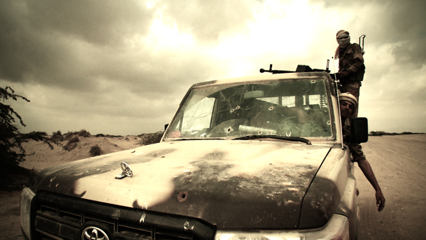 We pass the first front line on the outskirts of Zinjibar, “Tiger 1,” and drive a half-mile to “Tiger 2.” Sumali reluctantly agrees to let us get out. “We will only stay for two minutes,” he says. “It’s dangerous here.” The general is soon besieged by his men. They look thin and haggard, many with long beards and tattered uniforms or no uniforms at all. Some of them plead with Sumali to write them notes authorizing additional combat pay. One of the soldiers tells him, “I was with you when you were ambushed. I helped fight off the attack.” Sumali scribbles on a piece of paper and hands it to the soldier. The scene continues until Sumali gets back into the Toyota. As we drive away, he speaks from his armored vehicle through a loudspeaker at his men. “Keep fighting. Do not give up!”