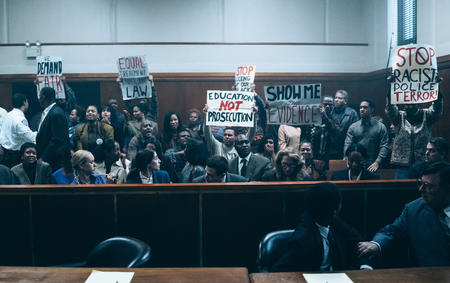 And then, of course, there’s the tendentiousness. DuVernay’s screenplay (assisted by Robin Swicord and Attica Locke) does not entirely resist the impulse to score points. Many of them are scored against Fairstein, played by Felicity Huffman in a late-’80s version of western villain wardrobe (her raincoat might as well be a gunslinger’s duster) and a scowl that could raise bloody welts. In case you don’t understand why five dark-skinned kids are about to be immolated on a prosecutorial altar, the dialogue written for Fairstein will tell you. The word “animals” comes up. The remark “We are not in control” leaves the definition of “we” unspecified and screamingly obvious.