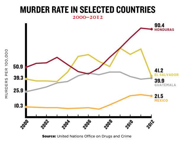 Violence is no less prevalent to the north or west. In 2013, the United Nations identified neighboring Honduras, which had ninety murders per 100,000 people in 2012, as the most violent country in the world. El Salvador was the fourth most violent; Guatemala, with forty murders per 100,000 people in 2012, the fifth.