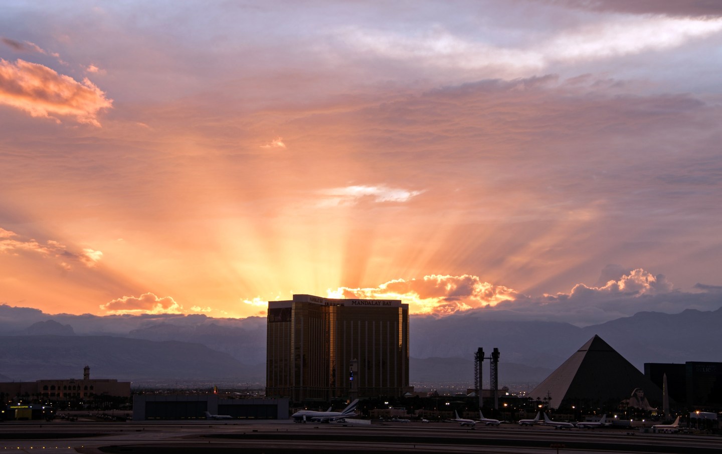Rays from the setting sun break through storm clouds west of the Mandalay Bay Resort and Casino.