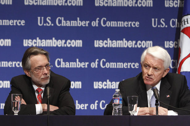 Chamber of Commerce President Thomas Donohue at a press conference. Major health insurers have given the chamber millions of dollars to campaign against healthcare reform but reported almost none of the transactions. (AP Photo/Jacquelyn Martin.)