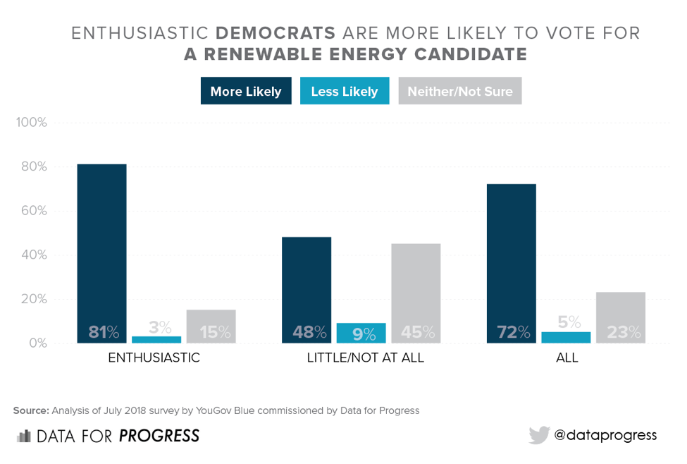 The more important question, however, is whether these preferences will change votes or turnout on Election Day. We also found signs this could be the case. Among eligible voters who expressed enthusiasm for the 2018 elections, 55 percent said they are more likely to vote for a candidate who supports a green-jobs guarantee. And 52 percent said they are more likely to vote for a candidate backing a 100-percent renewable-energy policy. Support for both policies jumps to 81 percent when questioning Democratic voters.