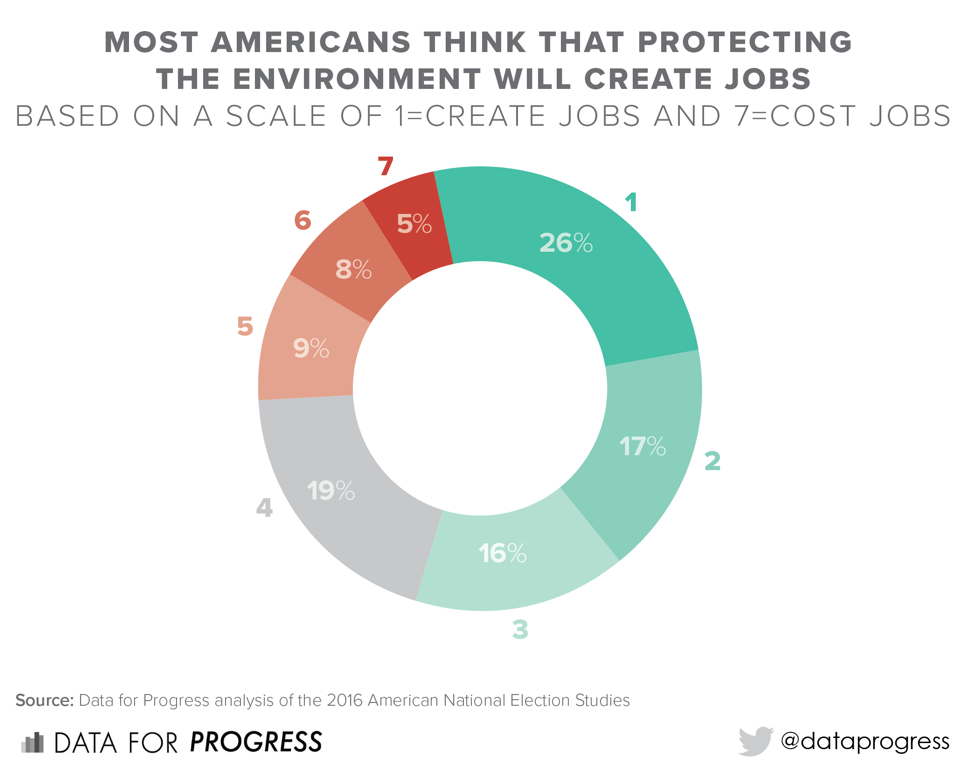 A message around green jobs would help progressives combat the myth that environmental policies harm workers. However, even the concern that voters buy in to this myth is overstated. Also in the American National Election Studies 2016 results, which Data For Progress analyzed, were opinions on whether environmental regulation creates jobs or costs jobs: Fifty-eight percent of Americans felt that protecting the environment would create jobs–while only 22 percent felt it would decrease the number of jobs.