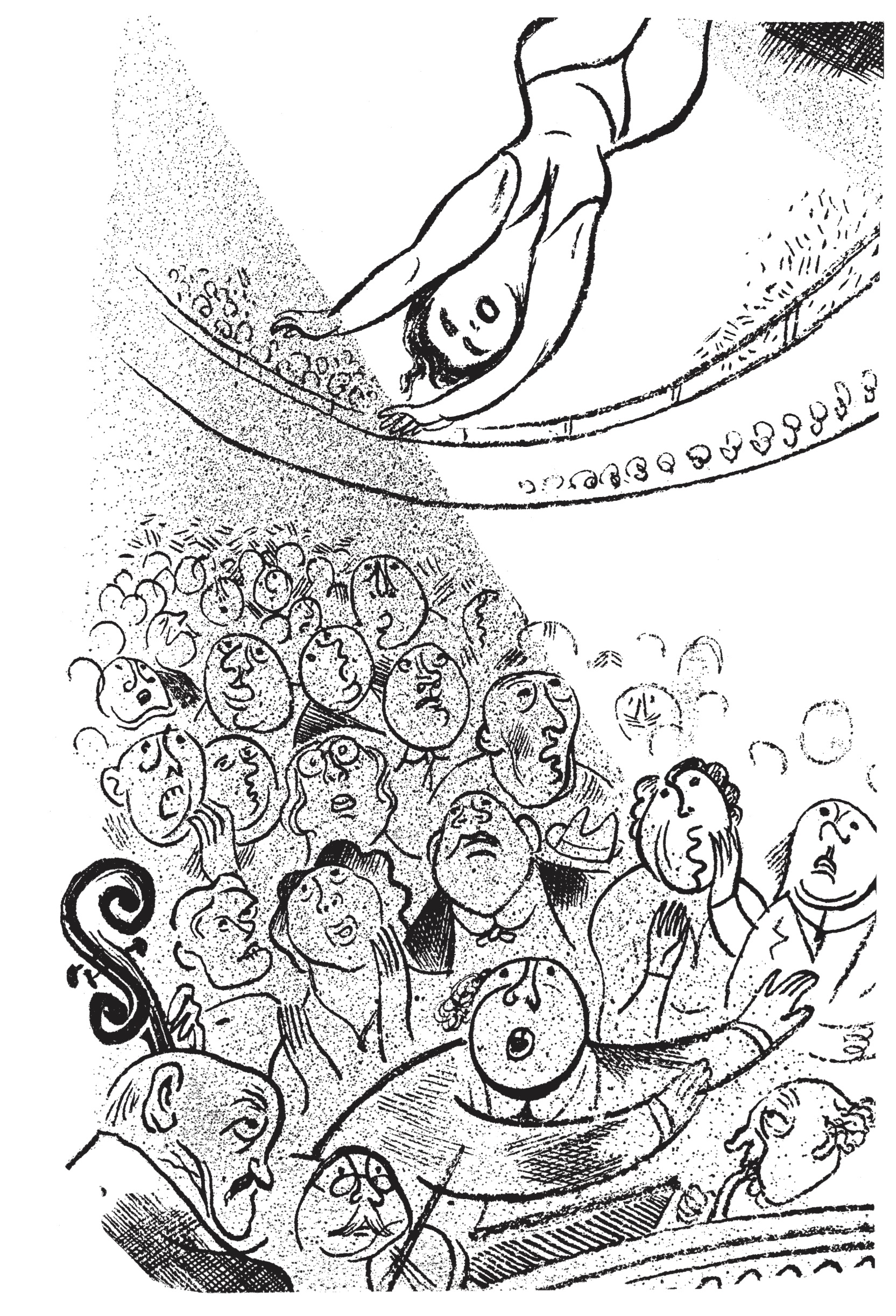 These are the contours of the story, which Gropper delivers through cannily expressive black-and-white art. When the singer falls for the acrobat, his mouth and body become heart shaped; when he screams at her, he turns into a morass of jagged, wavy lines. Gropper’s drawings can be busy and bursting, or they can be beautifully spare. The first seven images spotlight the acrobats as they soar through the open space of the otherwise blank page.