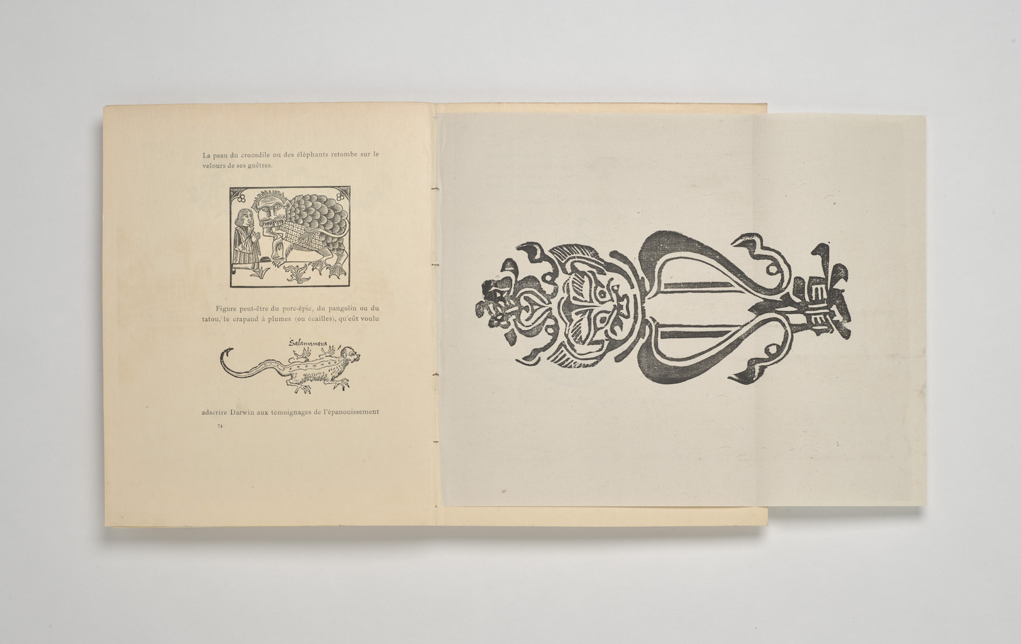 Still, Jarry’s influence skipped a generation. He had a habit of isolating friends, aided by his fondness for pranks and penchant for booze. Ubu Roi nearly bankrupted the Oeuvre, the famed Symbolist theater, and although he wrote often, his books made little money. By 1900, few of Jarry’s colleagues were willing to produce or publish his work, and he spent his final years dodging debts. When he couldn’t afford absinthe, he drank ether instead, and he died from tuberculosis in 1907, leaving behind a trilogy of plays featuring Ubu and his family, a collection of writings on theater, and several fantastical novels. The most influential, Exploits and Opinions of Dr. Faustroll, Pataphysician, was published in 1911 and reads like both a heroic epic and a scientific treatise, giving it the quality of a fable. It was mostly ignored outside of a few circles. The Surrealist poet Guillaume Apollinaire, Jarry’s drinking companion and one true disciple, wrote that it was the most significant book published that year; as it happens, Apollinaire also published his own first book of poetry, illustrated by woodcuts of medieval beasts. Picasso, a friend of Apollinaire, was enamored of Jarry’s public character; Picasso memorized passages of Ubu Roi, claimed his pet owls descended from Jarry’s, and purchased the writer’s papers and Bulldog revolver after his death.