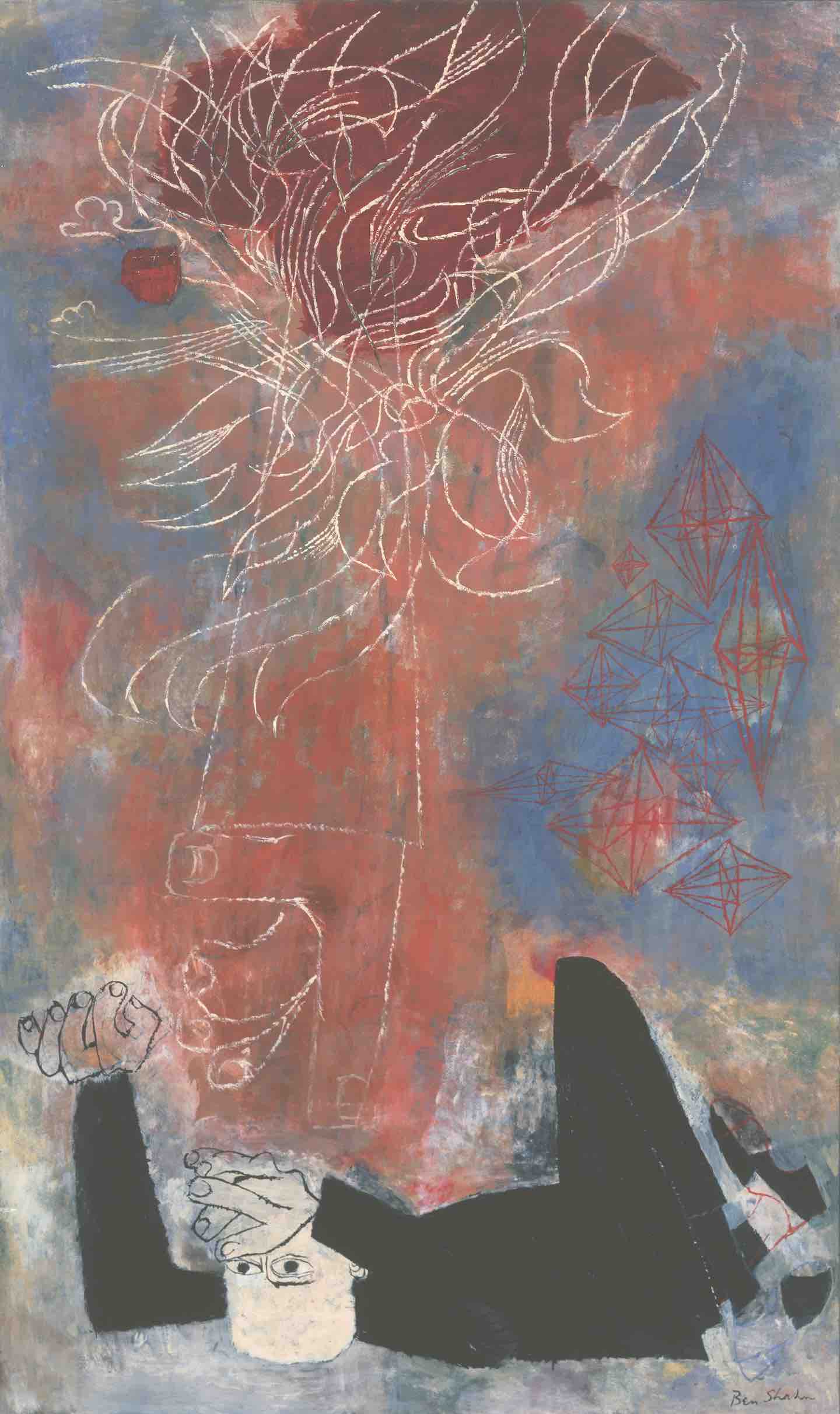 If Shahn’s early art took specific injustices as its starting point—Sacco and Vanzetti in the courtroom, miners on strike, workers waiting for relief—the aftermath of World War II propelled him into a different register. In place of the “accidental” details celebrated in the 1930s, Shahn pursued allegory: “I wanted to reach farther, to tap some sort of universal experience,” he wrote, “to create symbols that would have some such universal quality.”
