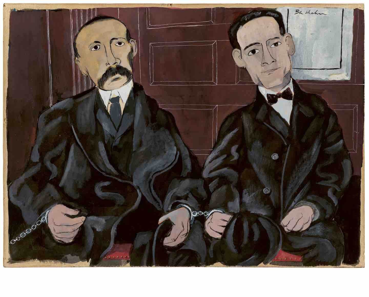 Apprenticed at age 14 as a lithographer on the Lower East Side, earning one dollar a week, it was here where Shahn developed the chiseled line that became his signature. These lines are most eloquent in the rendering of hands—bound together in chains, raised in demonstration, resting on coffins scratched out of the canvas. Tubular hands often stand for corruption, muscular ones for sincerity. Clothing, too, receives diagnostic attention, heavily modeled compared to the faces. “There’s a difference in the way a twelve-dollar coat wrinkles from the way a seventy-five-dollar coat wrinkles,” he remarked, “and that has to be right.” Status and exploitation reveal themselves not in the face but in the “accidental,” a much sought-after quality in American art of the 1930s that was rushing to capture the details of everyday life. Shahn packed his early paintings with such details—not to beautify or overwhelm but to give charged evidence, allowing the viewer to engage in a forensic exercise of discerning class, status, and social tension.