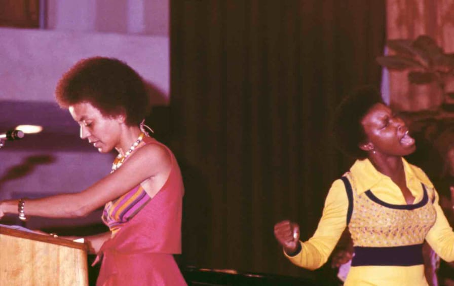The novelist Gayl Jones gives an astute response: “Women writers seem to depict essential mobility, essential identity to take place within the family and community. But perhaps for male writers that ‘place’ as well as those relationships are insignificant, restrictive, circumscribed.” In this response, Jones identifies the way that the terms of the Black sexism debate were often predicated on a false binary between individual and collective, between introspection and militancy, between home and the world. When Tate tries to characterize Nikki Giovanni’s earlier work as more militant than her later work, Giovanni balks: “I’ll tell you what’s wrong with that question,” she says. “The assumption inherent in that question is that the self is not a part of the body politic.” For most of the Black women writers interviewed—including Giovanni, Jones, Shange, and Sonia Sanchez—there is no separation between individual and collective liberation. Shange, who often wrote love poems about poverty, racism, and imperialism, argues that love can animate political struggle: “It’s simply that when I love somebody, I want my beloved in a world where those things aren’t occurring.”