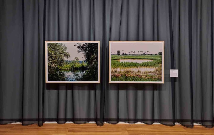 There is, I think, more to it than that. Rattana’s website records his view that photographs are inherently “fictional constructions, abstract and poetic surfaces, histories of their own.” To evoke fiction and poetry in this context does not mean that in suggesting that what we see as simple pools of water originated as bomb craters he might be misleading us. It means that what we see (or think we see) in a picture—or, indeed, what we see on the spot in a place whose history is unfamiliar to us—is conjecture at best. The image may be a surface, but its meaning is below the surface, and that’s what makes the surface resonant.