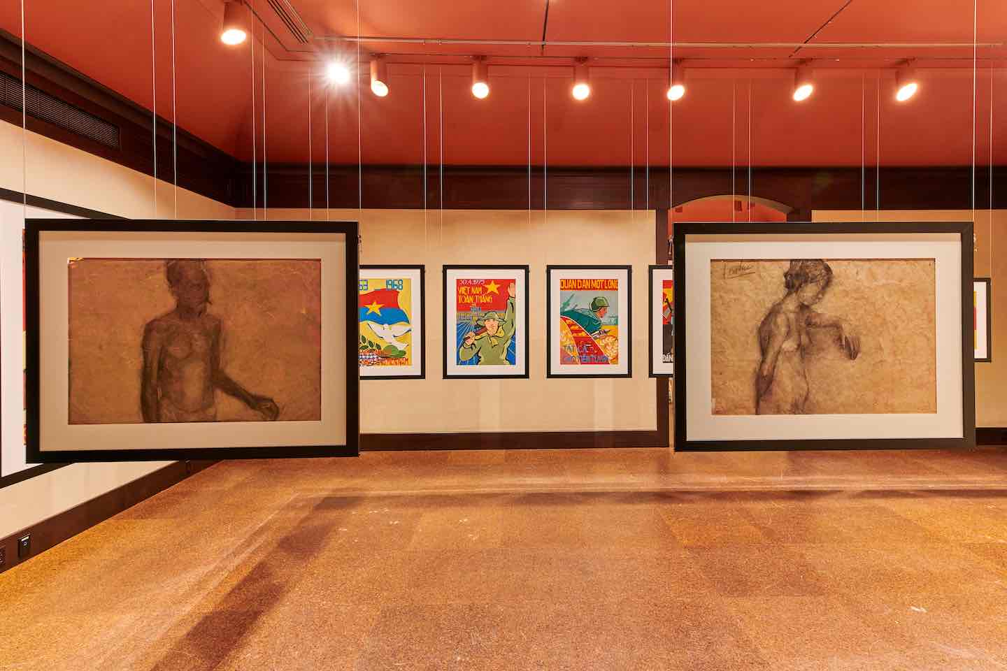 While the posters call for militant resistance against US forces in Vietnam and are designed to incite nationalist fervor, their reverse shows war-weary figures rendered vulnerable, fragile, desired, and beautiful, against blank, indeterminate backgrounds. On one side, these works show bodies in service of state ideology, and on the other, bodies in formation and momentarily emancipated from imposed obligations.