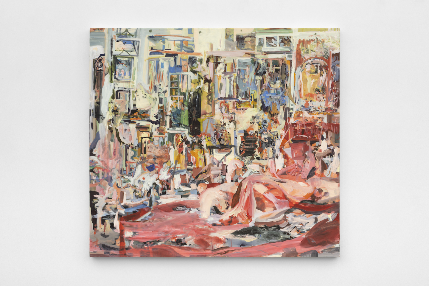 Still, my preference in Brown’s oeuvre is not for such grand-scale extravaganzas. At a more everyday scale, in pictures whose basic parameters can be taken in all at once, one can more readily appreciate just how beautifully she has woven together the paintings’ complex surfaces out of so many suave and fluid pathways of paint. It’s rewarding to lose yourself in the incessant movement of colors only to realize you’re not lost at all, but as it were subliminally led to comprehend the work’s overall structure. Among the most intriguing smaller works here were some, such as Selfie (2020) that depict interiors whose walls are packed with perpendicular, rectilinear elements, quite different from the mashed-up shards of form out of which her imagery usually coagulates—apparently pictures densely pinned up. You see walls like that in corners of artists’ studios, where they pin out postcards, snapshots, and reproductions torn from magazines or books—anything they think they might be able to use for visual inspiration. On the floor in the foreground, some not-quite-legible coupling seems to be going on. Or it could be an ancient Greek wrestling match—who knows? What counts, I think, is how those slippery-slidey fluid forms play off against the dominating rectangular ones and somehow subvert them. If this setting is the studio, then the semilegible figures at the bottom turn the painting into an allegory of artmaking as an erotic struggle.