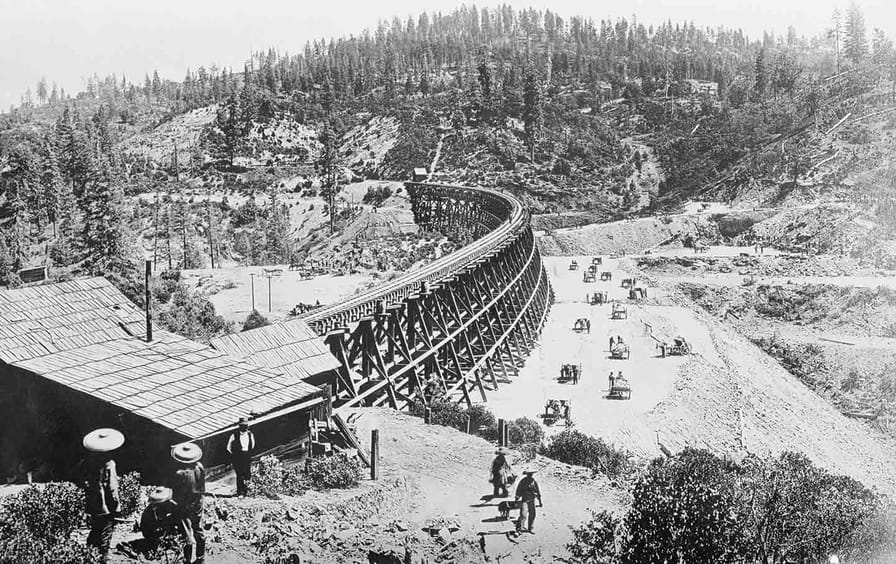 Six hundred and ninety miles of the Transcontinental Railroad were laid by Chinese immigrants. Many of them were drawn to California by the gold rush of the late 1840s, but a scant decade later, the land had been depleted of riches, and they arrived instead to encounter unfriendly locals who distrusted foreign faces. The construction of the Central Pacific Railroad, the segment of the Transcontinental Railroad that stretched from Sacramento to Utah’s Promontory Summit, began in 1863, and white foremen quickly recruited Chinese immigrants looking for work to do the most physically demanding labor, compensating them at a fraction of the pay that whites received. By 1867, Chinese immigrants made up about 90 percent of the Central Pacific’s labor force. Historians estimate that at least 1,200 died in the construction of the railroad—approximately two Chinese men for every mile of track they laid.