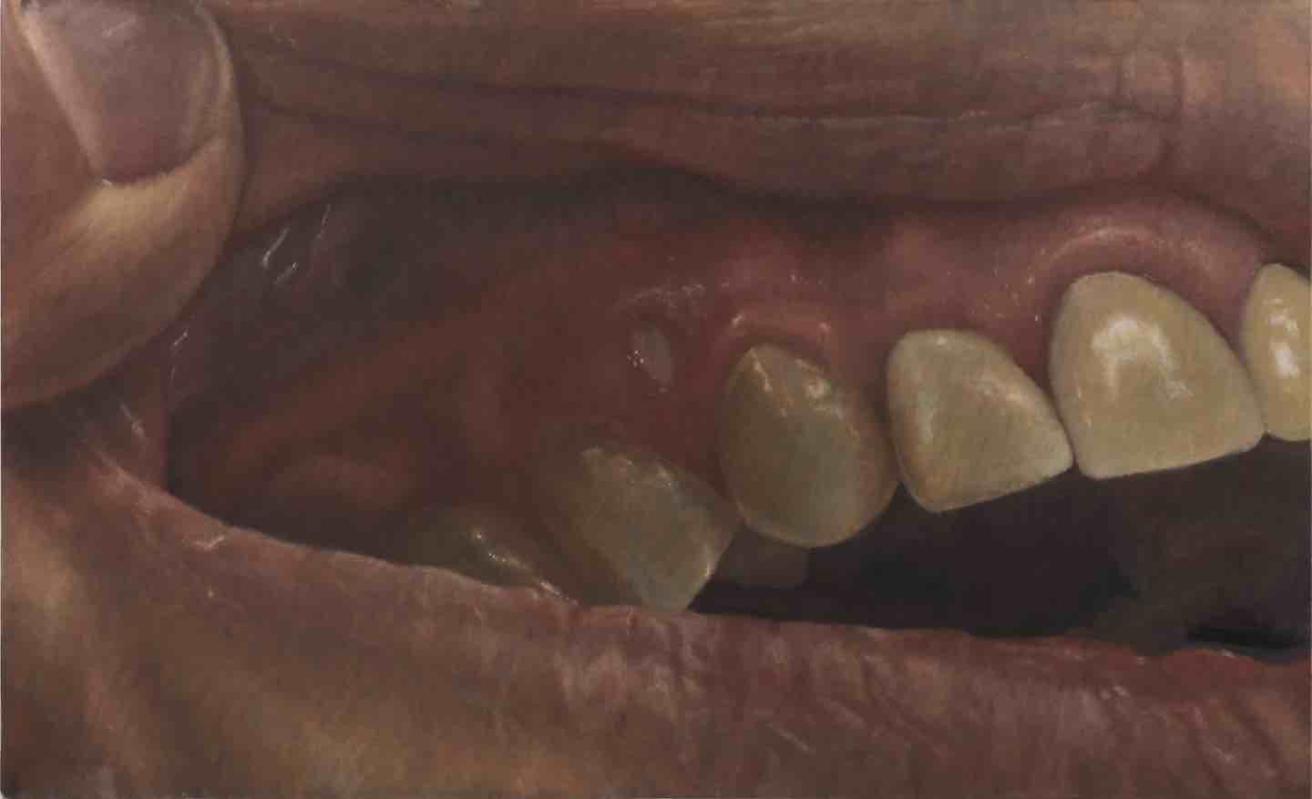 Like Tuymans, Wood cultivates a cool, detached style, tonally muffled and chromatically understated. Her subjects typically fill the frame, as if being examined in extreme close-up; the choices are odd, sometimes almost inexplicably surreal: a cow’s udder, the seat of a car, a toy rabbit—things that become odd just through being closely observed, like a word that turns into nonsense by being repeated. People appear only as isolated fragments—a hand on a door knob, a finger pulling lips back to show teeth and gums—while inanimate things stand in for people: An armor helmet is offered as a self-portrait, titled Me at the season finale, 2022; what looks at first like the back of a woman’s neck must in fact represent that of a mannequin, judging by the hole that seems to have been gouged into it.