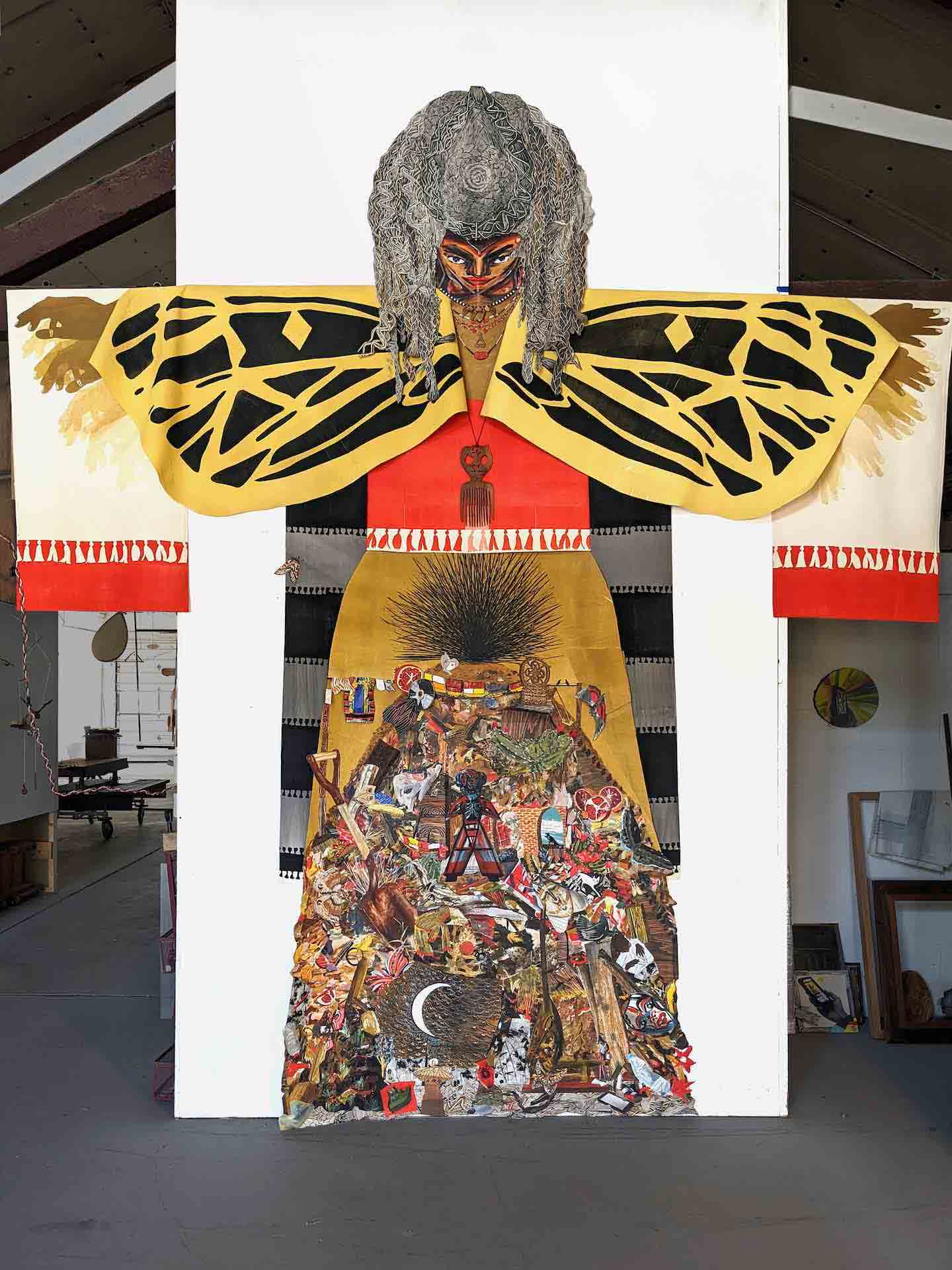 Luckily, however, while Wilson has continued to develop a mastery of any number of distinct conventions and techniques—the current show encompassing printmaking, collage, painting, sculpture, and video—she handles them with a freedom that underlines a decidedly unconventional mind. One’s first view of the show is dramatic: On the wall facing the gallery door, reaching nearly to the ceiling, is a 13-foot-high assemblage, of acrylic and oil paints alongside wooden and beaded jewelry made in collaboration with Mike Lagg, depicting a towering hieratic figure, titled Earth Angel, 2022, with outspread arms garbed in a vast pair of butterfly wings. She bows her head to gaze down knowingly at the crowded world over which she presides, all gathered under her skirts, like the Madonna of Mercy in Medieval and Renaissance art. But unlike the Roman Catholic icon, Wilson’s colorfully winged earth mother shelters not only humanity but more or less everything, a sort of fecund chaos in which the human image plays a small part, and then only indirectly—in the representation of a face as a mask. But these are far outnumbered by other living beings, animal or vegetable (a moth or some oranges), as well as inanimate things, natural or manufactured—tools like shovels, for example, feature prominently. Is this Earth Angel observing the world we are destroying—the mass of images under her skirts might recall the choking debris left behind by a terrible flood—or simply the glut of stuff our world contains before one has imposed a conceptual order on it? Wilson generously allows for both possibilities.