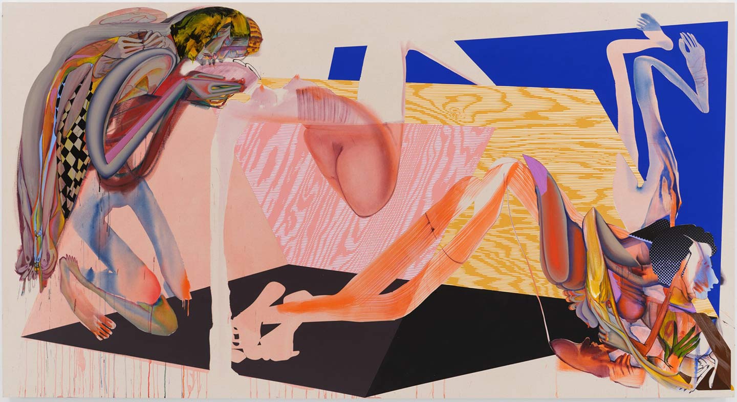 Quarles uses geometrical elements in her work to suggest contingent or transient architectures—walls, ground planes, and skies reconceived as theatrical stage sets rather than as natural realities—that place her protagonists in airless, claustrophobic spaces that we viewers, nonetheless, can contemplate from the outside. Take, for example, Same Shit, Diff’rent Day, 2022. The closest thing in this horizontal composition to a coherently legible figure is the one kneeling on the left; but its legs are merely more or less leg-shaped, disembodied color stains, and it somehow has three pairs of hands. Cradled in its hands is the featureless head of another, even more elusive ghost of a figure, which seems to be tumbling over a sheet of plywood leaning over, one of three planes that provide a simple geometric grounding to the images—but that figure is mostly a sort of blank phantom. Meanwhile, a third figure to the right holds a sort of downward-facing dog position, but its body and limbs are an indistinguishable mix of bulbous forms. Quarles’s figures are Frankenstein monsters built out of ill-assorted fragments. That’s not only true of what’s depicted but also of how these creatures are depicted.