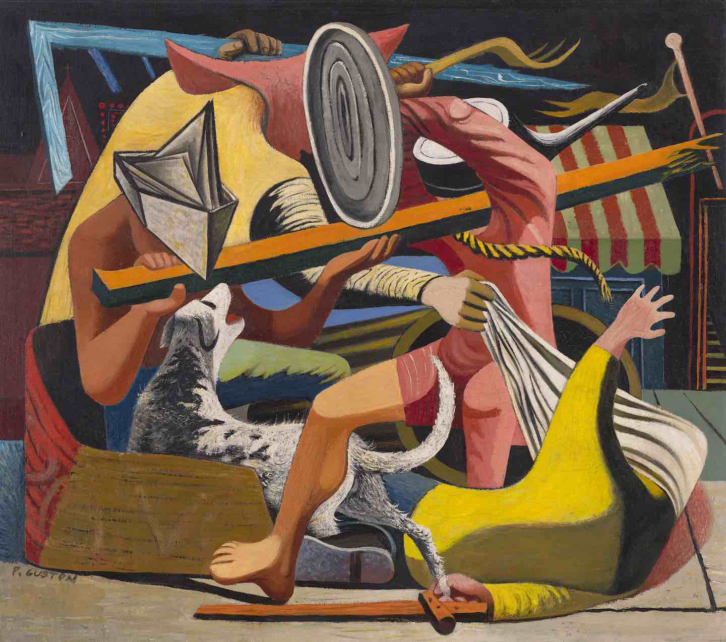 Guston’s career fell into three discrete periods, each one separated from the next by a period of profound self-questioning, months or even years of stymied productivity. The first period, when Guston was trying, uneasily, to reconcile his veneration of Renaissance art with his feelings about modernity, began around the time he finished high school in 1929. His art from then through the mid- to late 1940s included both politically inspired works and ones of a dreamier, more melancholy, symbolic cast. Then, around 1947, he started pushing himself toward abstraction—a radical shift for him. But he only really found his footing as an abstractionist around four years later.