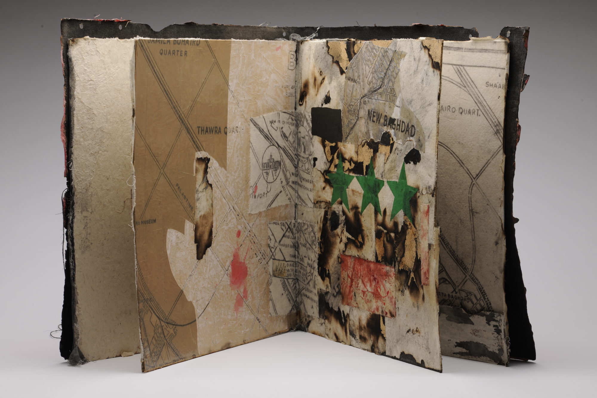 Another Iraqi artist whose dafatir are particularly striking is Hanaa Malallah, who left Baghdad in 2006 and now lives in London. Her dafatir follow what she calls a “ruins technique”—their pages burned and, as it were, attacked, like relics of violence rather than representations of it. Nada Shabout writes in the exhibition catalog that such works offer “a contemplative space in which to articulate the contemporary moment through an abstraction akin to that of installation, offering a full exhibition through its various pages as a complete, discrete project, and as such provides an alternative interpretation of monumentality.” In other words, the space between the covers of a book allows for a grand scale in the imagination, if not in literal space like an installation. Such books burrow into a space of intimacy and enlarge it to convey a realm of experience that is at once collective and individual. Ghassan Ghaib, who now lives in Los Angeles, offers in his Homage to al-Mutanabbi Street 1 (2007), a book-object closed in on itself, at once destroyed and preserved, tied shut with barbed wire. Its explosive content, which we can only imagine, seems to be contained, but only under immense pressure.