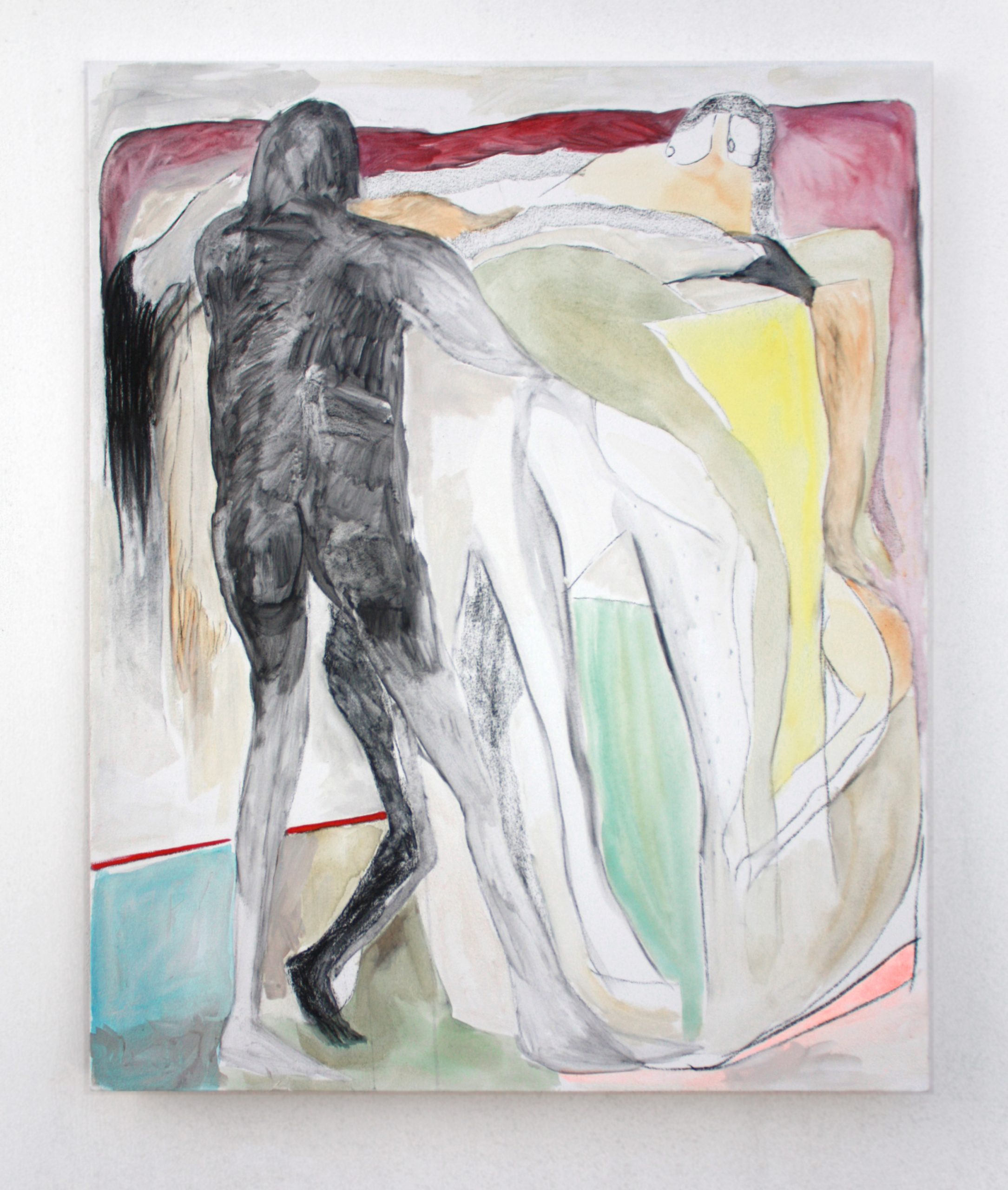 This turned out to be the new home of Proxyco Gallery, a place specializing in art from Latin America that I had previously visited in its former, smaller quarters further east on Suffolk Street. What had pulled me through the door were paintings in which pale, luminous colors adumbrate distorted, fragmented, ectoplasmic bodies arrayed in closed and yet somehow not claustrophobic environments. The point was clearly not how bodies look, but how it feels to have them, be them—a visual translation of a subjective perception. This, clearly, was the work of a painter with a beautifully light touch yet a blunt approach to drawing, someone adept at registering nuances of sensation without overemphasis—and with a sense of humor!