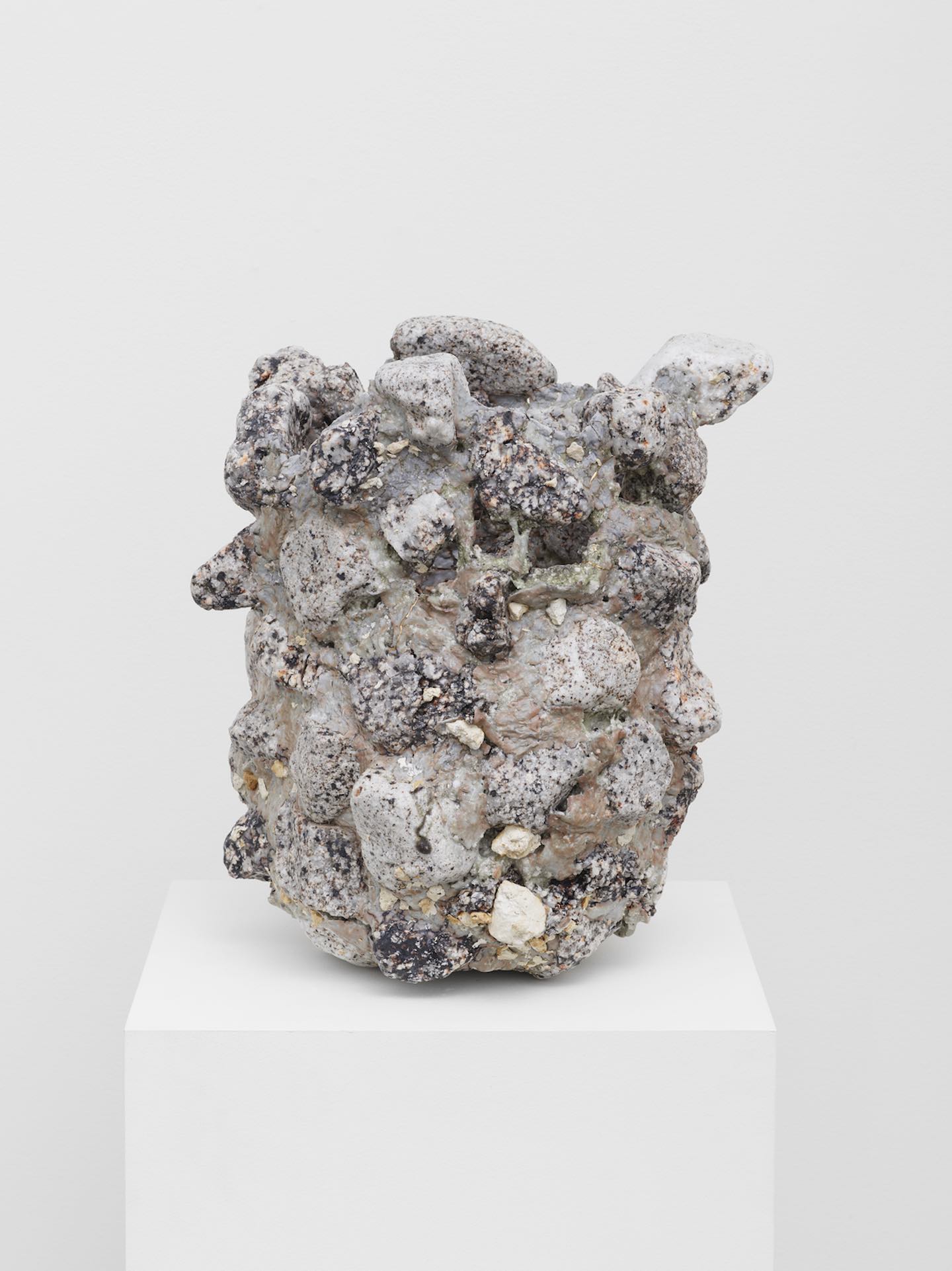 In fact, many of Yasunaga’s objects look more like they’re made of unusually coarse concrete than anything else. I don’t really understand how he manages to coax a material that’s normally not self-supporting to hold these agglomerations together and function as the structural basis of his forms. The gallery press release explains it this way: “Combined with unique raw materials such as feldspars, whole rocks, metal or glass powders, Yasunaga’s forms are buried in various strata of sand or kaolin (unrefined porcelain clay) to preserve their structure in the firing stage. After cooling, Yasunaga’s sculptures are excavated from their beds in a studio process analogous to archaeological excavation and discovery.” In any case, the resulting objects don’t look quite like anything I’ve seen before. But the gallery’s evocation of archaeological finds is apt; encrusted as they are with pebbles and sand, one might well imagine that these objects had been dredged up from some ancient burial site where they have lain for eons, their forms distorted by the pressure of the earth’s weight as they’ve accreted all sorts of mineral substances foreign to their original makeup.