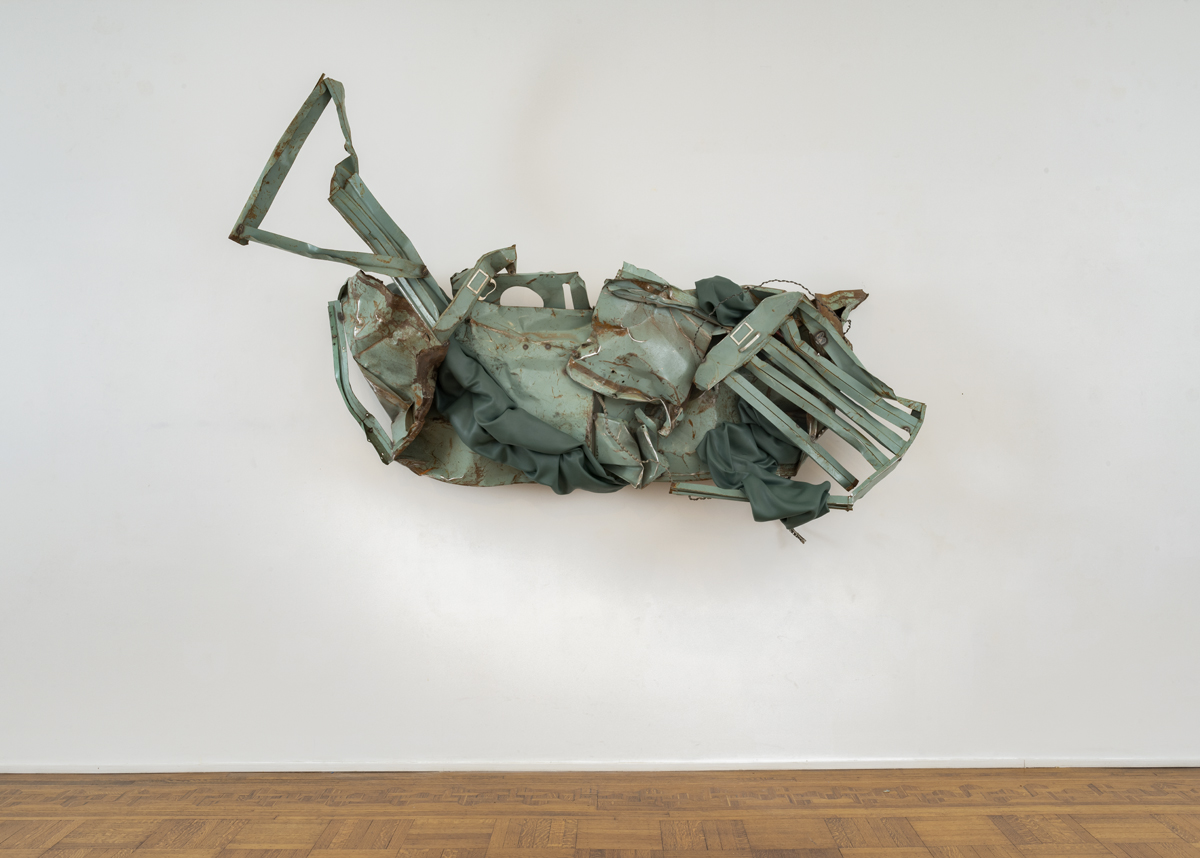 Another sculptor who does unexpected things with materials is Kennedy Yanko, an American born in St. Louis in 1988 and now living in Brooklyn. But her inventiveness may not be apparent at first glance—although it took only a couple of images of Yanko’s work, posted on Instagram by an acquaintance (with no commentary, just the name of the artist and gallery), to make me head over to her exhibition “Postcapitalist Desire,” at the Tilton Gallery on Manhattan’s Upper East Side. The six works in the show are assemblages, mostly wall-mounted rather than freestanding, featuring salvaged and reworked scrap metal—twisted, crushed, and crumpled forms that might remind you of, for instance, the sculptures made of smashed car parts for which John Chamberlain became famous in the 1960s, or of the found-object assemblages of John Outterbridge, the remarkable and still underknown Los Angeles–based African American artist, who passed away last year. “In castoffs there are profound treasures,” said Outterbridge, who also exhibited at the Tilton Gallery—and he proved it.