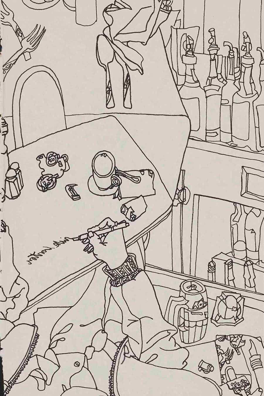 Alone Again is not unusual, in Barton’s oeuvre, in conflating two distinct viewpoints—only, perhaps, in the neatness of the dichotomy between them. While his drawings are typically more or less based on observation of his surroundings, they eschew the putative realism that pretends to show the entirety of a single scene at a single moment. Barton’s best drawings construct their own fictive places out of a multiplicity of moments. Rick Barton’s Chinese Line (April 25, 1960) shows a quartet of musicians playing in a run-down domestic interior—bare light bulbs, a ramshackle bookshelf, and an upright piano that is not the sort that would likely appear on a concert stage. And yet, in the foreground, there are the heads of an audience facing the rostrum, and at the left there’s a fragmentary view of a couple of musicians (presumably the same ones, but who can say?) shown from a different angle and much closer up, perhaps from the viewpoint of one of their fellow players; and above these float a few more audience heads glimpsed from behind. But strangest of all, at the center of the drawing, there’s Vermeer’s famous kitchen maid pouring milk, the modestly scaled painting blown up so that its monumental figure appears to be as large as the four musicians—and the pitcher of milk has taken the place of the pianist’s head! Barton’s is, evidently, the realism of dreams.