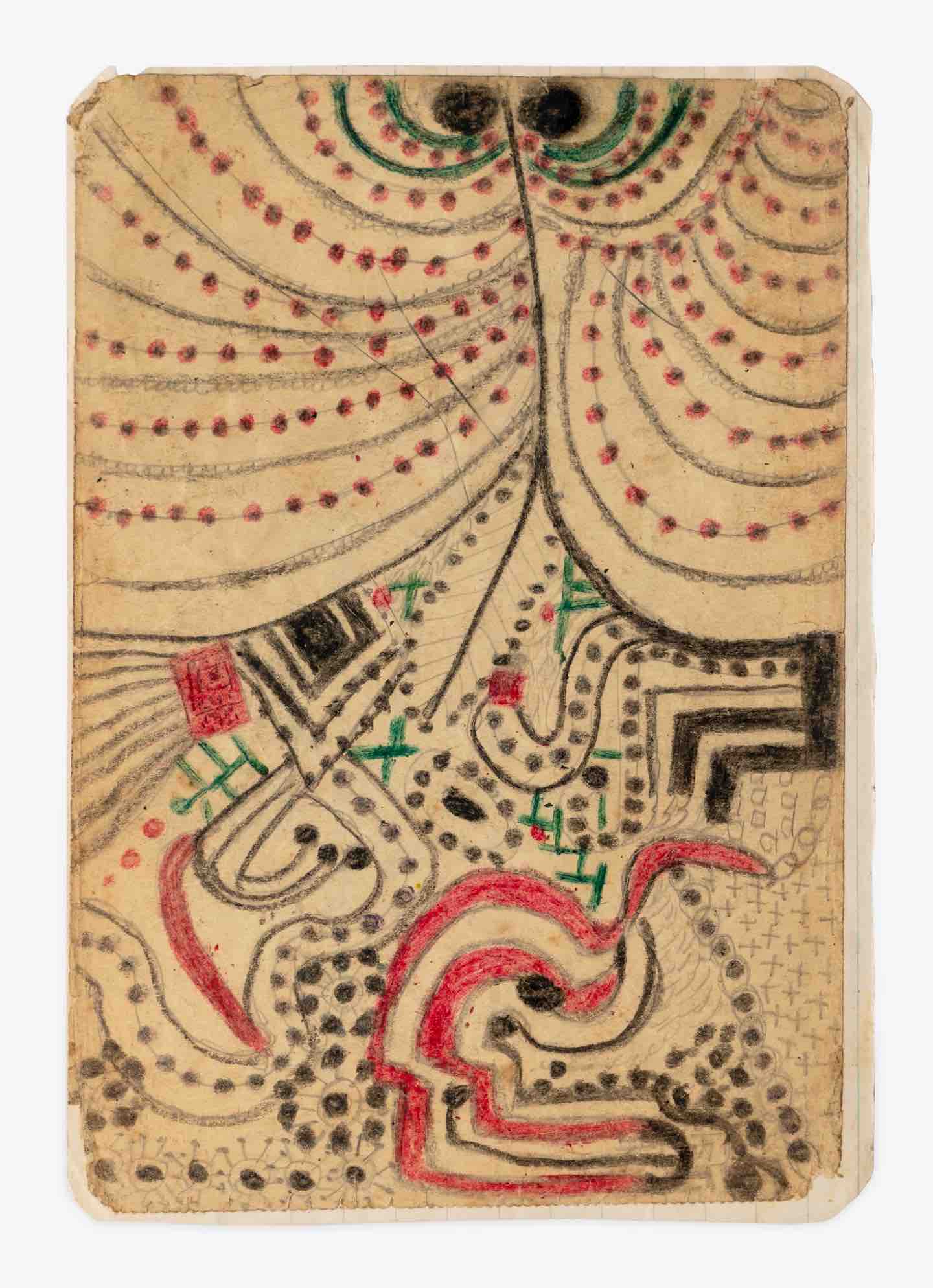 That many of the artists in Gorney’s exhibition had unconventional ways of seeing the world would be evident from the art they produced, but this idiosyncrasy is further underlined by the biographical notes he has provided on the gallery’s website. Emery Blagdon, for instance, “believed his creations generated electromagnetic energy with immense healing properties.” A delicately intricate hanging construction of wire and bits of metal might look like a sanitorium for a colony of pet crickets; Blagdon’s paintings, by contrast, are bluntly diagrammatic, loosely brushed designs that seem to map the interactions of unnamable energies. Minnie Evans reflected that her art may have “come from the nations, I suppose, that might have been destroyed before the flood,” while Madge Gill, one of the most renowned of outsider artists, “believed that a spirit guide named ‘Myrninerest’ guided her hand and authored her drawings.”