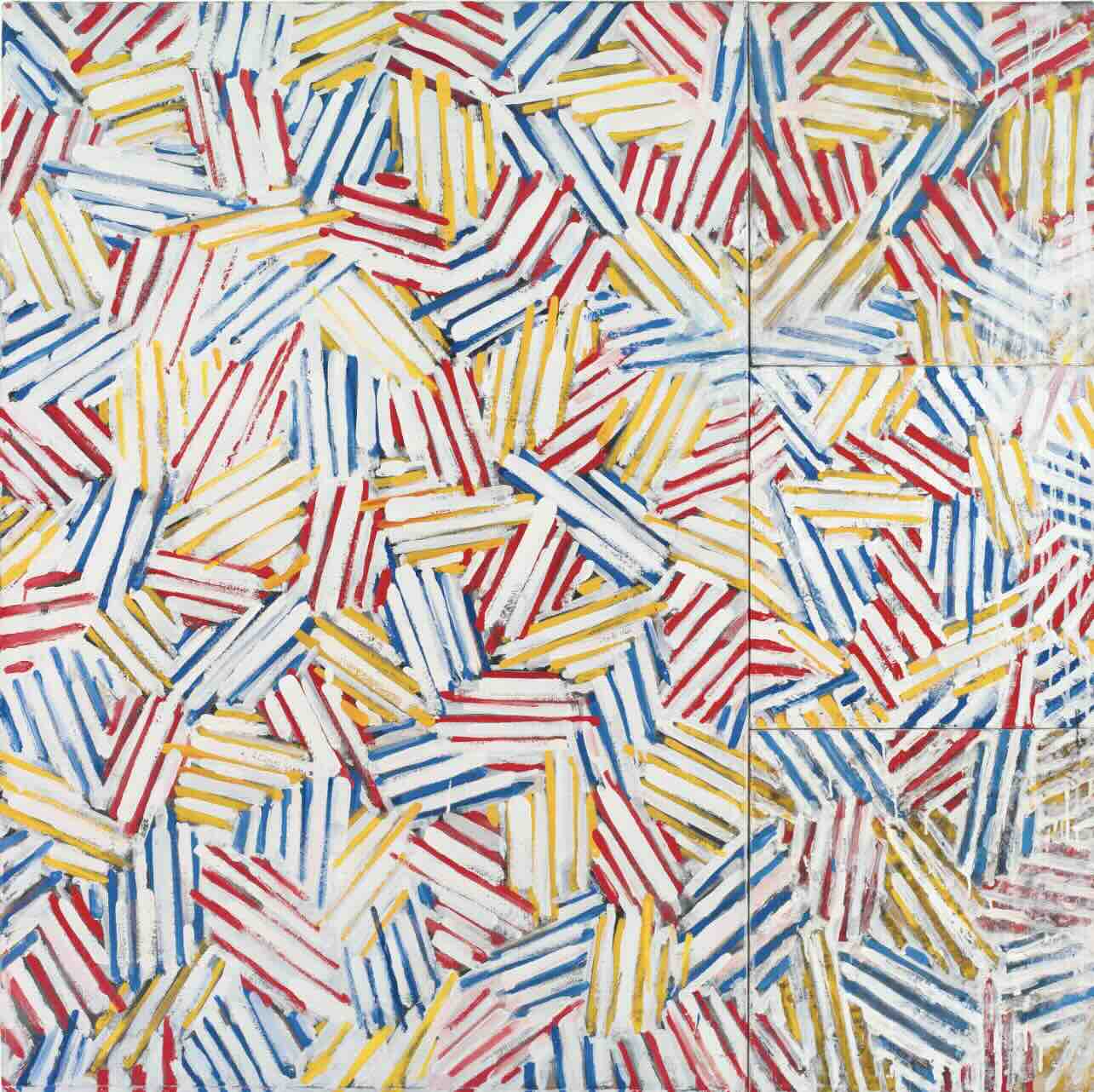 Even so, the everyday pattern remains tied to a vernacular reality. It’s significant that Johns’s venture into abstraction did not take off from this citation from Munch, but rather found an echo there after the fact. Instead, it took its inspiration from the simplest marks that an artist could possibly make: straight lines. Perhaps reminiscent of the parallel bands of red and white that Johns had painted before in the guise of the US flag, the lines in these paintings of the 1970s and ’80s have been liberated by the artist from such specific references without denying a broader sense of referentiality. It’s not just that they could so easily recall something as commonplace as the design of a bedspread. It’s that the intricacy of the compositional structures Johns could build out of these multidirectional arrays of simple lines—full of mirrorings and inversions, like a modernist 12-tone musical composition made by manipulating a single tonal row—suggests an almost obsessive fixation on some unfathomable implication that might be secreted in these arrays of brushstrokes. One feels that the artist is at once encoding and trying to decode something that he can’t quite put his finger on. If Johns were to claim they might be messages from antediluvian civilizations, I wouldn’t entirely be surprised—but instead he keeps a wise silence. He’s another of those artists who know how to work with the absolute minimum and make a vast world of it.