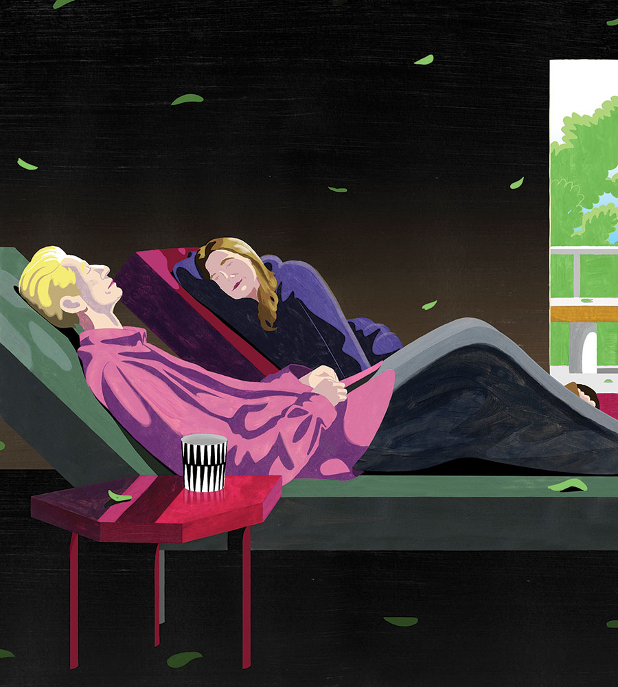 There are other differences as well. Nunez’s narrator and her friend are nameless, but in Almodóvar’s film the two have names: Ingrid and Martha. They also have very famous faces: those of Julianne Moore and Tilda Swinton. Moore’s Ingrid is not to be confused with Nunez’s narrator; she is a woman facing some of the same circumstances, but she is her own character. The movie starts about 100 pages into the novel, when the dying Martha asks Ingrid for help in ending her life, and in lieu of developing the sparse backstories that Nunez hints at, Almodóvar uses the novel as an emotional template to start mixing his own palette, quite literally. While the novel deals more with the narrator’s inner life than her outer one, The Room Next Door emphasizes the opposition between Ingrid and Martha visually, making material what are more spiritual and emotional differences in the book. In a set of jarring but gorgeous contrasts between Ingrid’s vivid, jewel-toned wardrobe and Martha’s pallor, which indicates a previously vibrant life now drained of color, we are told the story not only through dialogue and flashbacks but also through the bold colors and almost palpable textures that tend to define an Almodóvar film. By dispensing with the novel’s first half—in which we gain so much insight into Nunez’s version of the character and how she functions—Almodóvar frees himself from the burden of fidelity, announcing that the film is simply not the book. The difference in title also makes this clear: Sigrid Nunez wrote What Are You Going Through, while Pedro Almodóvar wrote and directed The Room Next Door.