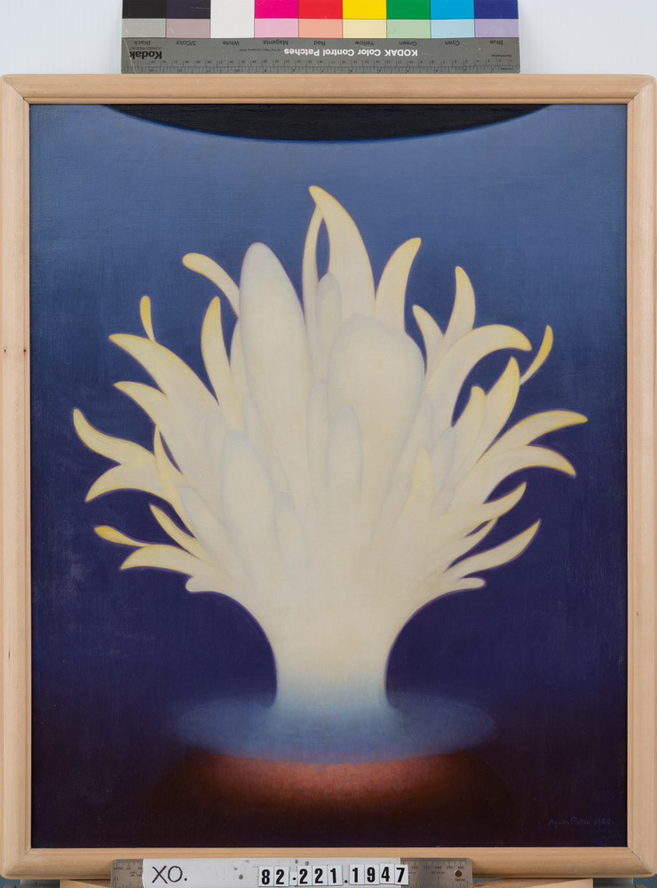 “Is This the Next Hilma af Klint?” read the headline of an Artnet article introducing readers to Agnes Pelton—the TPG’s star artist—on the occasion of her first posthumous traveling museum show, in 2020. The similarities are evident: Af Klint and Pelton belonged to different generations of the same occult movement that swept through bourgeois social circles starting in the mid-1800s, which involved salon parties with séances and hypnosis. They both painted celestial motifs with round, fleshy edges and utilized a candy-color palette, though af Klint’s abstractions are composed of flat geometric lines, and Pelton’s are dimensional and richly textured.
