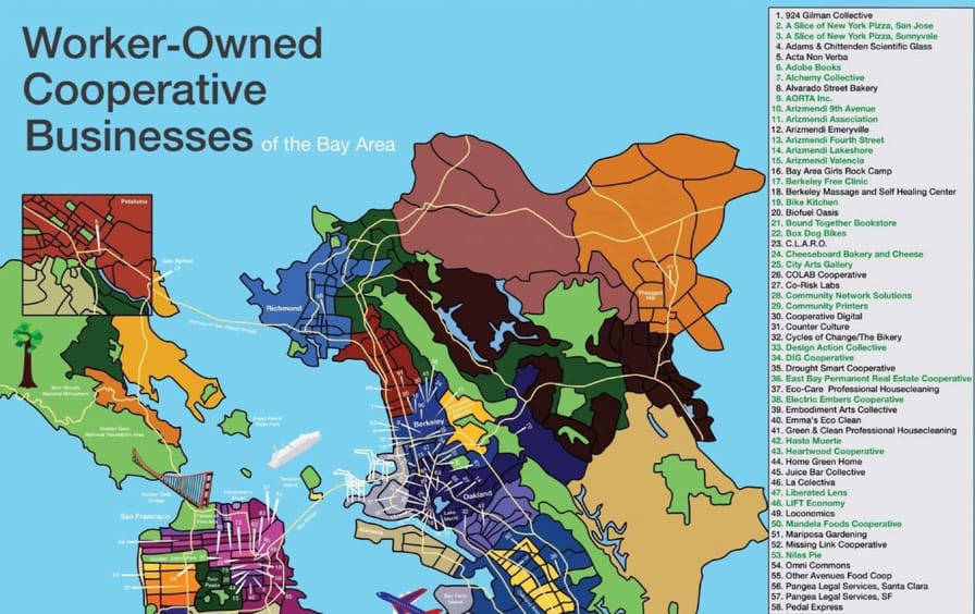 Of course, businesses that are owned and democratically operated by workers are not limited to Northern California—you can have your marine habitat surveyed by a worker-owned business in Washington, and purchase cooperative cannabis in Illinois. Co-op employees will put solar panels on your home in Colorado, and care for your kids in Ohio. But California leads the nation with an estimated 20 percent of America’s co-ops, the majority of which are in the Bay Area.