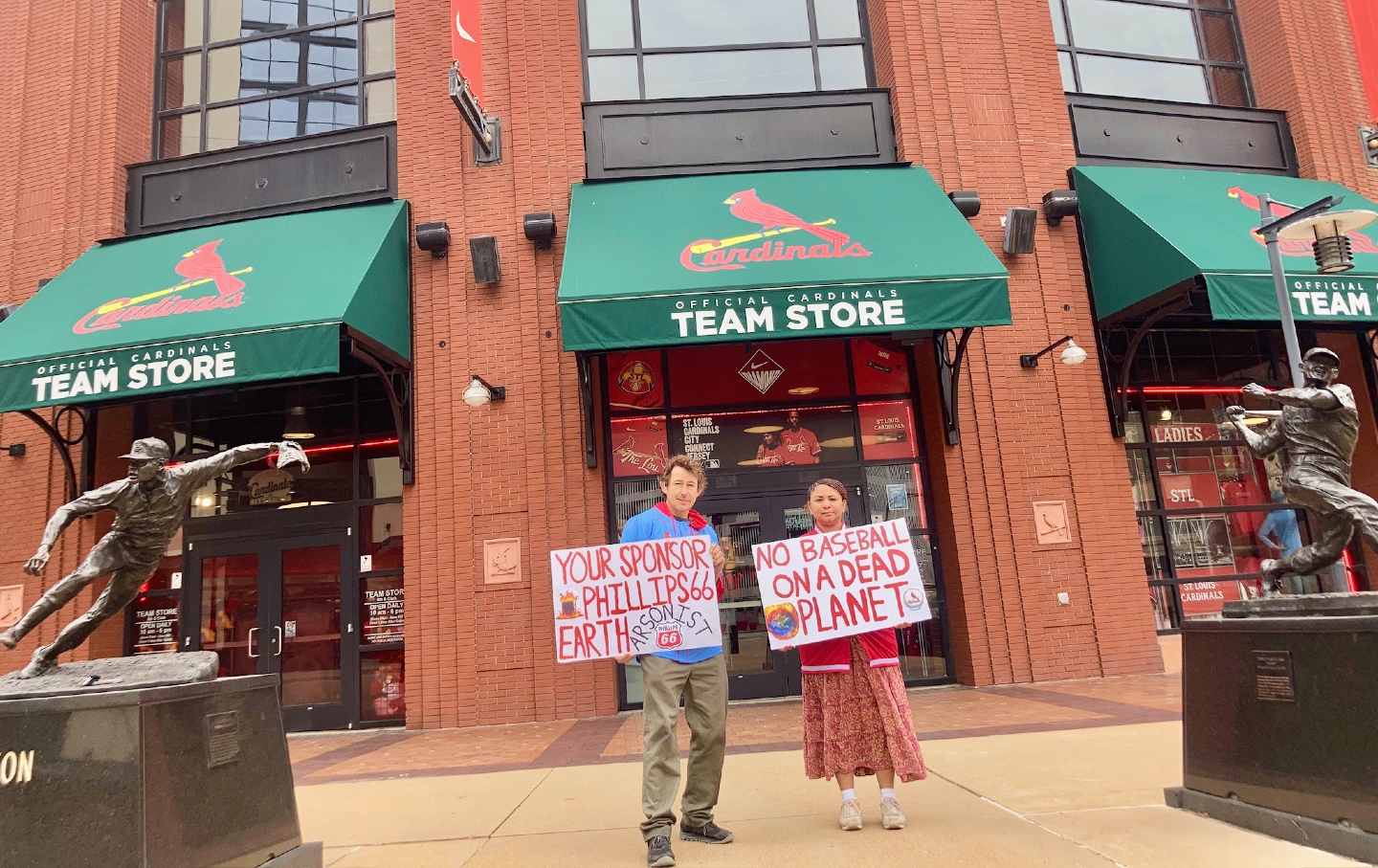 Jim Steitz, left, and Mahala Pittman, right, protest outside of Busch Stadium, objecting to the Phillips 66 sponsorship of the Cardinals, in St. Louis.(Jim Steitz)