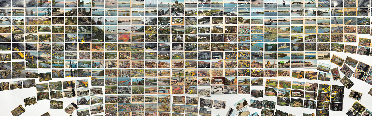 New York–based artist David Opdyke had already been addressing climate change, among other political issues, by way of semi-monumental sculptures and bas-reliefs for a good decade and a half when, in the mid-2010s, he began to shift the polarities of his practice. He took vintage postcards of the American pastoral from the early 20th century (hand-tinted black-and-white photographic vantages celebrating local courthouses, highways, parks, dams, recreation areas, forests, or agricultural vistas) and injected them with trenchant contemporary political commentary by means of subtly compressed painterly interventions. Then for a year, starting in 2017, he reverted to the monumental, gradually unfurling This Land, an epic gridlike mural, more than 16 feet long by eight feet high, consisting of over 500 such individually treated postcards.