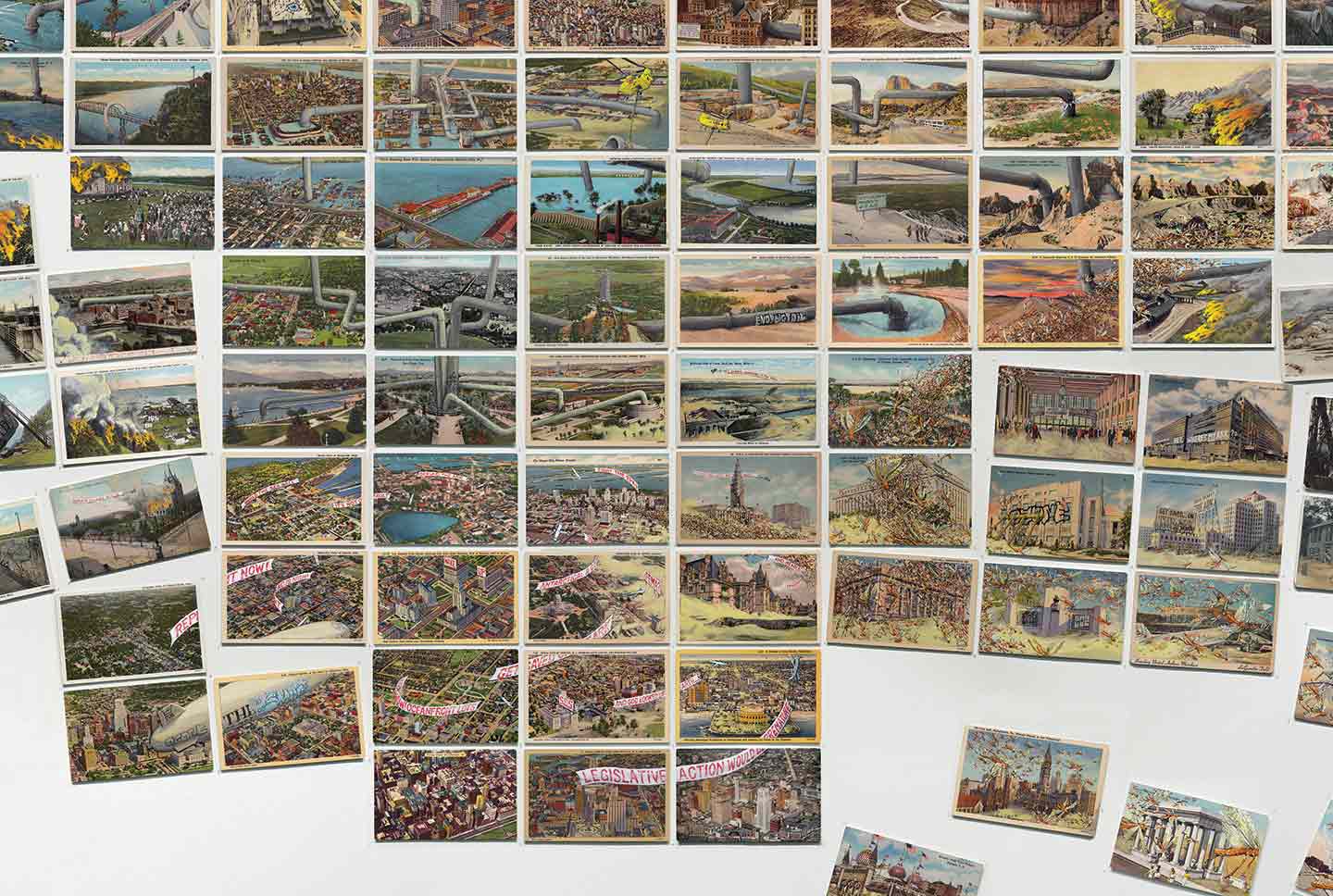 What from a distance at first presents itself as a single bird’s-eye view of a vast alpine vista (mountains, lakes, sunrise), upon close examination, sure enough, proves to be fashioned out of hundreds of those postcards celebrating the American dream as conjured up at the turn of the last century. But when you advance closer still, Opdyke’s myriad sly interventions within and between cards begin to reveal a harrowing nightmare vision of the potentially rampaging effects of global warming: fires, floods, droughts, tornadoes, plagues of locusts, murders of crows, butterflies adrift in the snow, a cacophony of political responses, panicked traffic jams, pipelines run amok slathered with livid graffiti, immiserated homeless encampments, Alcatraz Island given over to high-rise luxury apartment buildings (secure prisons for the rich), even an actual ark under construction. “During the months I was working on the piece,” Opdyke recalls, “I figured I was portraying the way things could well get in two or three decades if climate change continued to go unaddressed. But two years on and it’s pretty obvious the timeline has proved much, much tighter: The fires out west, the pandemic, hurricanes barreling in one hot on the next—they’re all already here now.”