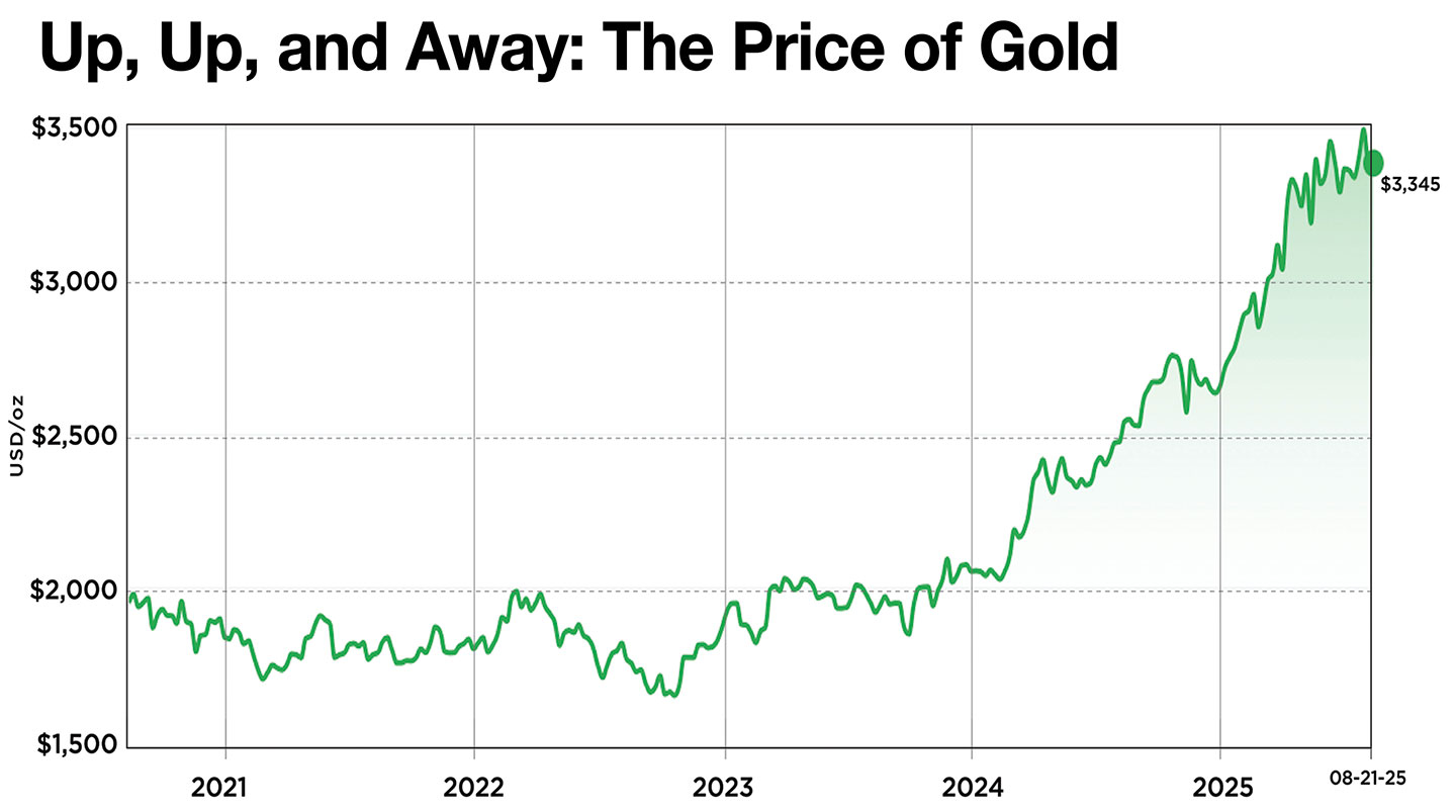 Observers of this latest gold rush trace its origins to the global instability of the past few years, beginning with Russia’s invasion of Ukraine. That jolt, in 2022, sent investors worldwide flocking to gold—known as a “safe-haven asset” for its enduring value—causing its price to soar. A year and a half later, the uncertainty ushered in by the war in Gaza drove the price of gold even higher. And then, earlier this year, came Donald Trump: His tariff threats turbocharged the phenomenon, with the price of gold hitting an all-time high in April.