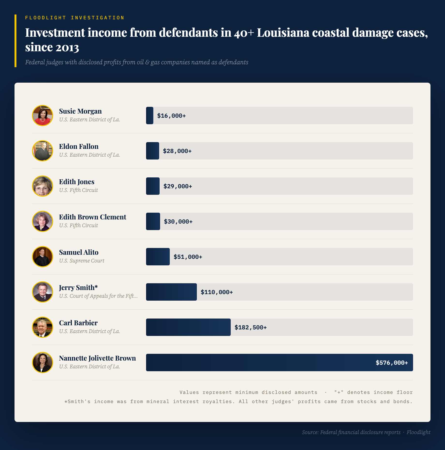 Federal judges with disclosed profits from oil & gas companies named as defendants. Click to enlarge.(Brad Racino / Floodlight built with Claude)