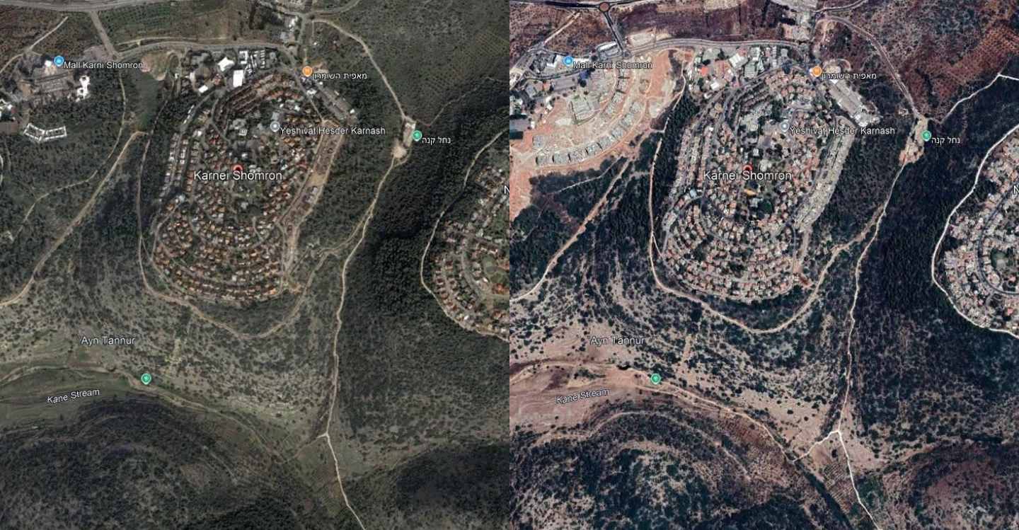 The Karnei Shomron settlement covers 257 acres, of which at least 23 acres were previously a nature reserve, according to maps provided by the Geomolj Geospatial Information System in Palestine and current as of 2019. In addition, satellite imagery shows that the settlement continued to expand from 2019 to 2023. Likewise, the Ginot Shomron settlement expanded partly by carving out five acres from the nature reserve, according to Geomolj maps, and satellite imagery shows that urbanization intensified between 2014 and 2023.