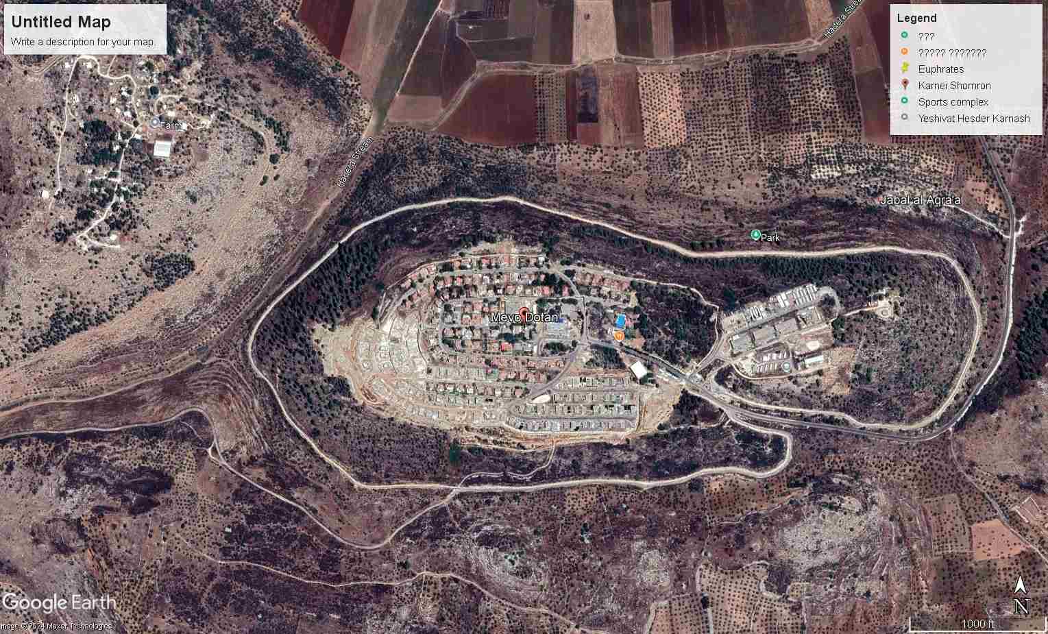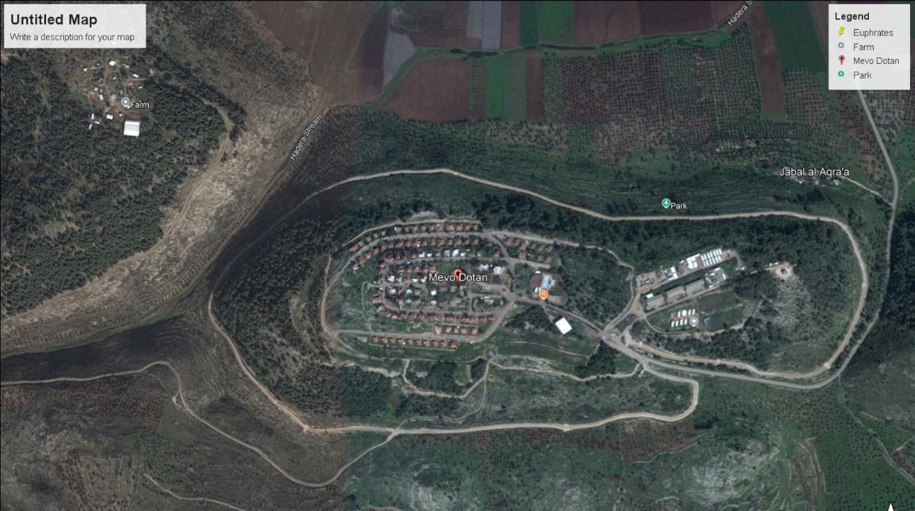 One of the settlements is Mevo Dotan, part of which was built in the Alonei Arava nature reserve, whose name refers to the oak trees—in Arabic, alonim—that grew there. Satellite imagery taken between 2016 and 2023 shows the cutting of cultivated areas south of Mevo Dotan and the construction of buildings.