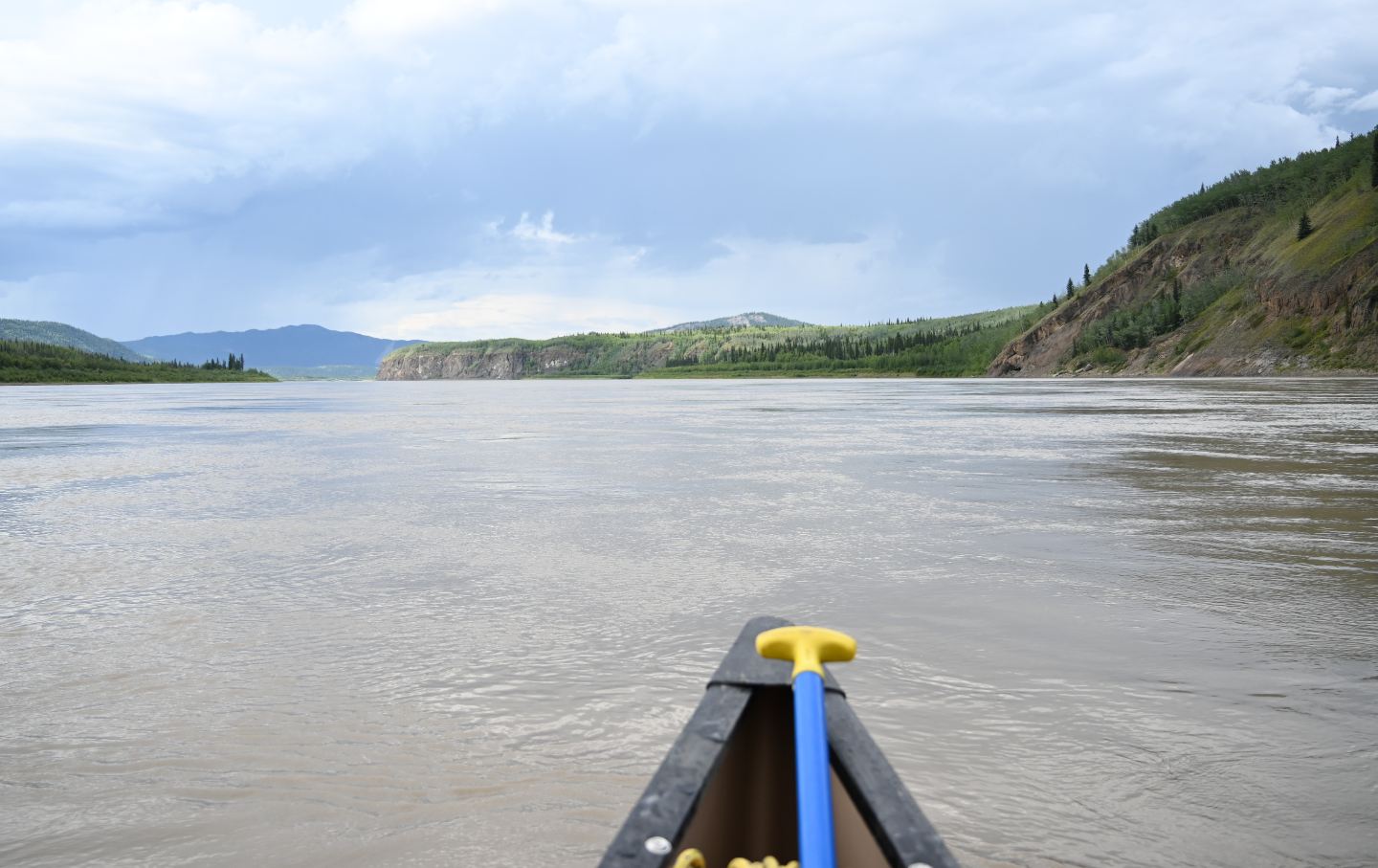 The bow of the canoe aims down the middle of the Yukon River near the Alaska-Canada border.(Colin A. Warren)