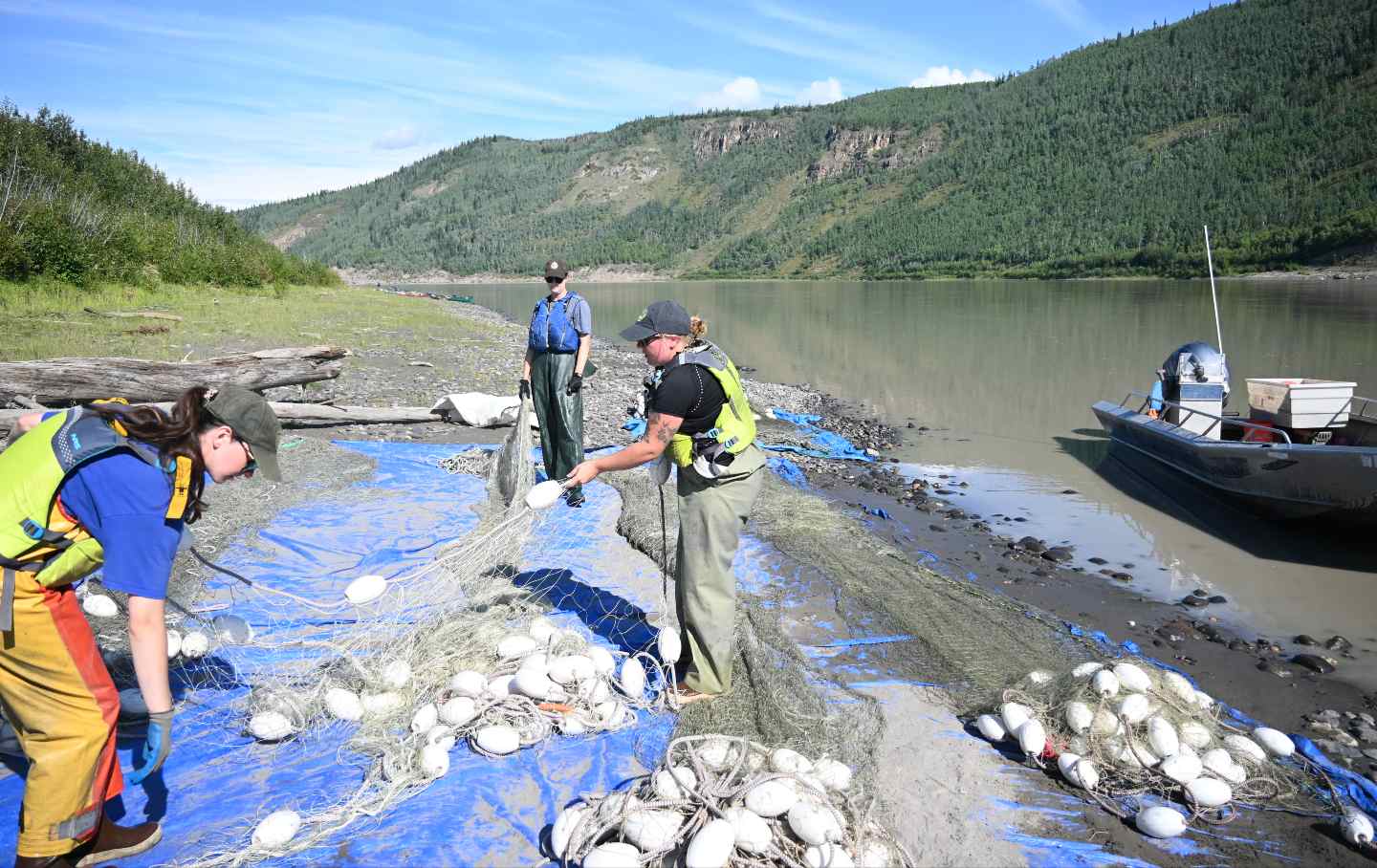 Three Canadian federal fisheries employees untangle a net at the Eagle sonar station.(Colin A. Warren)