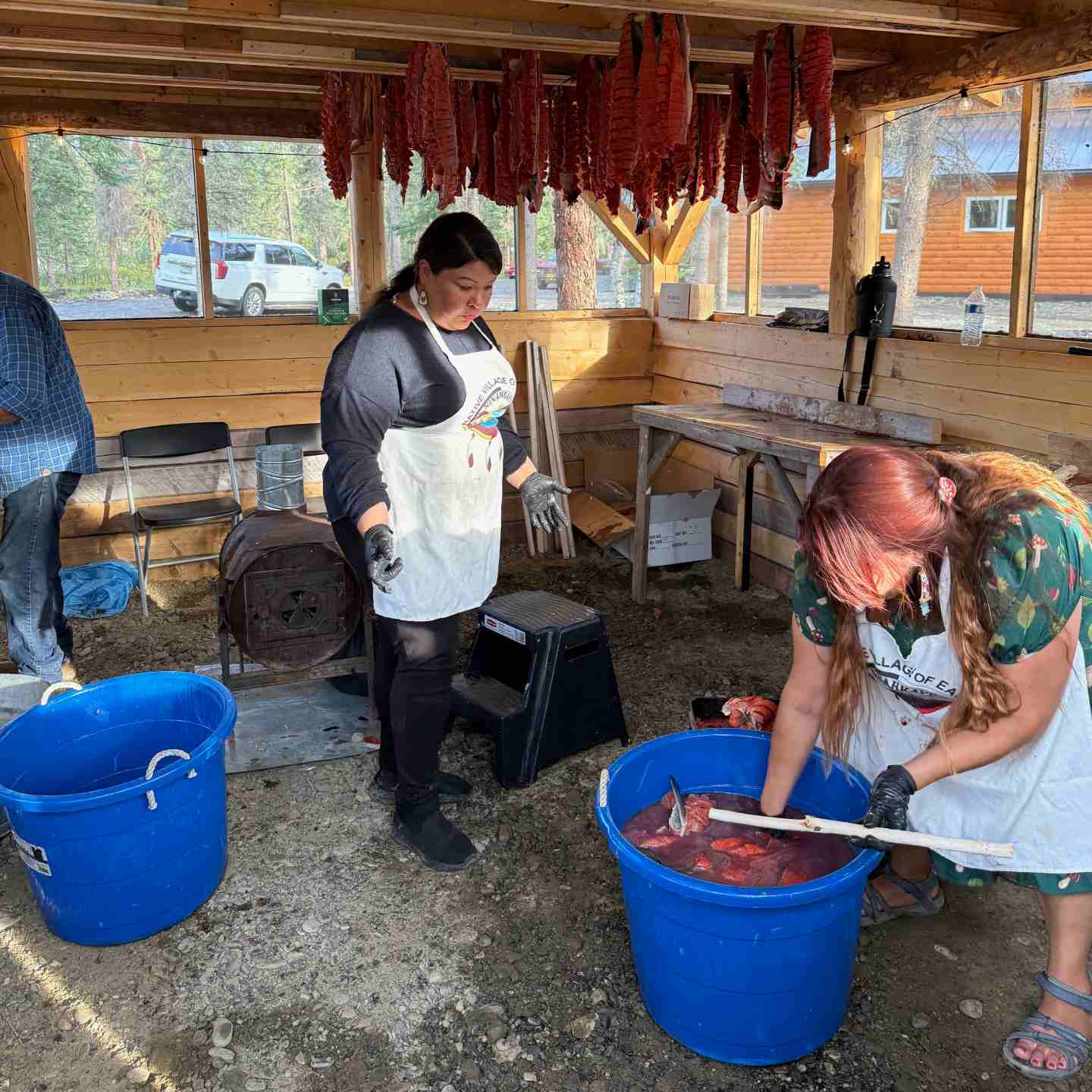 Chief Karma Ulvi, left, hangs brined salmon to cure at the Village of Eagle’s first culture camp in August 2025.(Photo courtesy of Karma Ulvi)